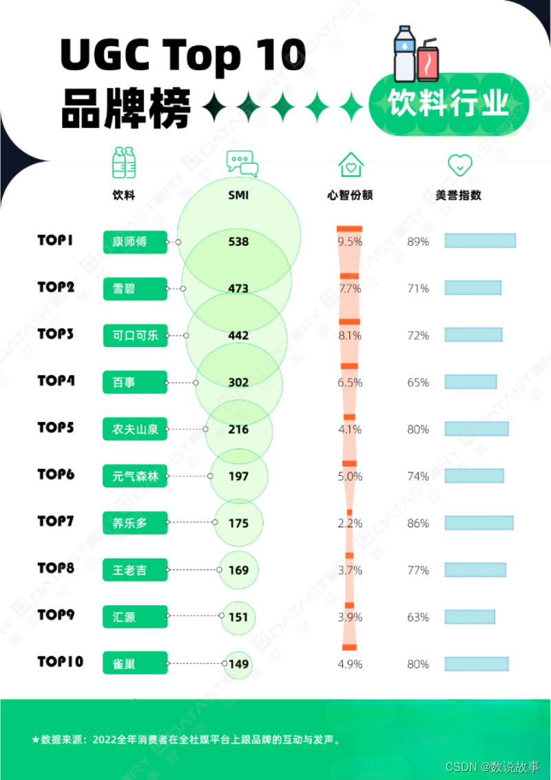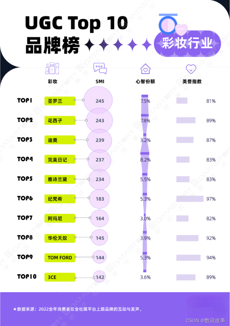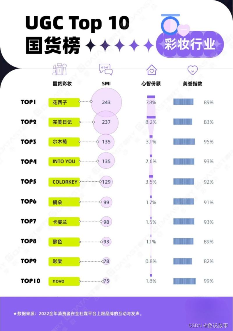 心智驱动行为,行为映射心智,这是让消费者记住你、需要你、喜欢你的基本逻辑。在全域的社媒营销中,从认知到相关,品牌需要做的是激发消费者与品牌互动的兴趣;从相关到喜爱,品牌需要通过场景沟通促使消费者相信品牌能解决需求;更进一步,品牌为消费者提供优质的体验,让消费者对品牌满意,从而触发消费者为品牌发声。数说故事根据消费者的社媒行为,从消费者互动-发声-好评,构建出行业首个社媒心智指数SMI (Social Mind Index),能够多维度综合反应品牌在社媒上对消费者心智的影响力,让品牌更好地听见消费者真实的声音,帮助品牌正确决策。