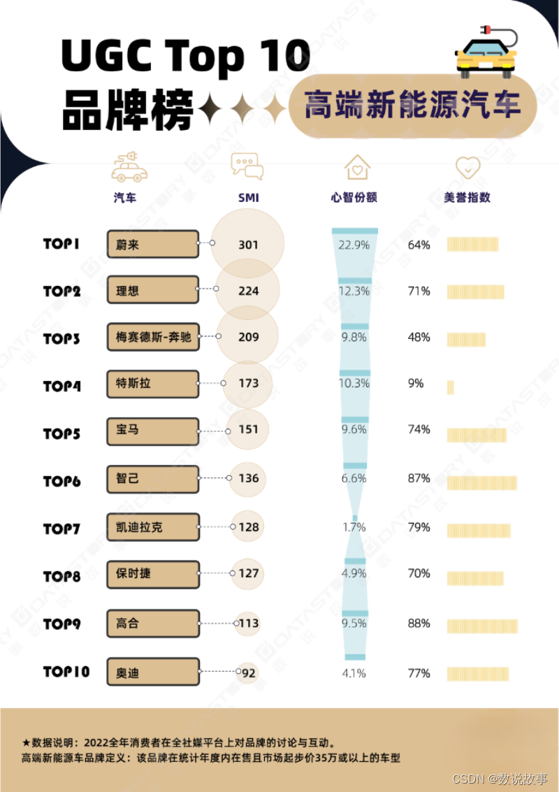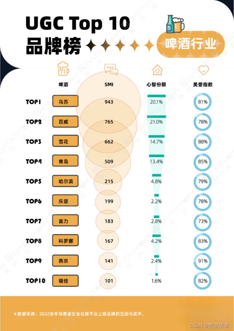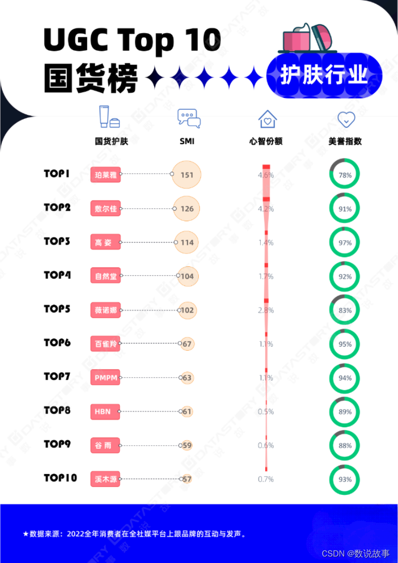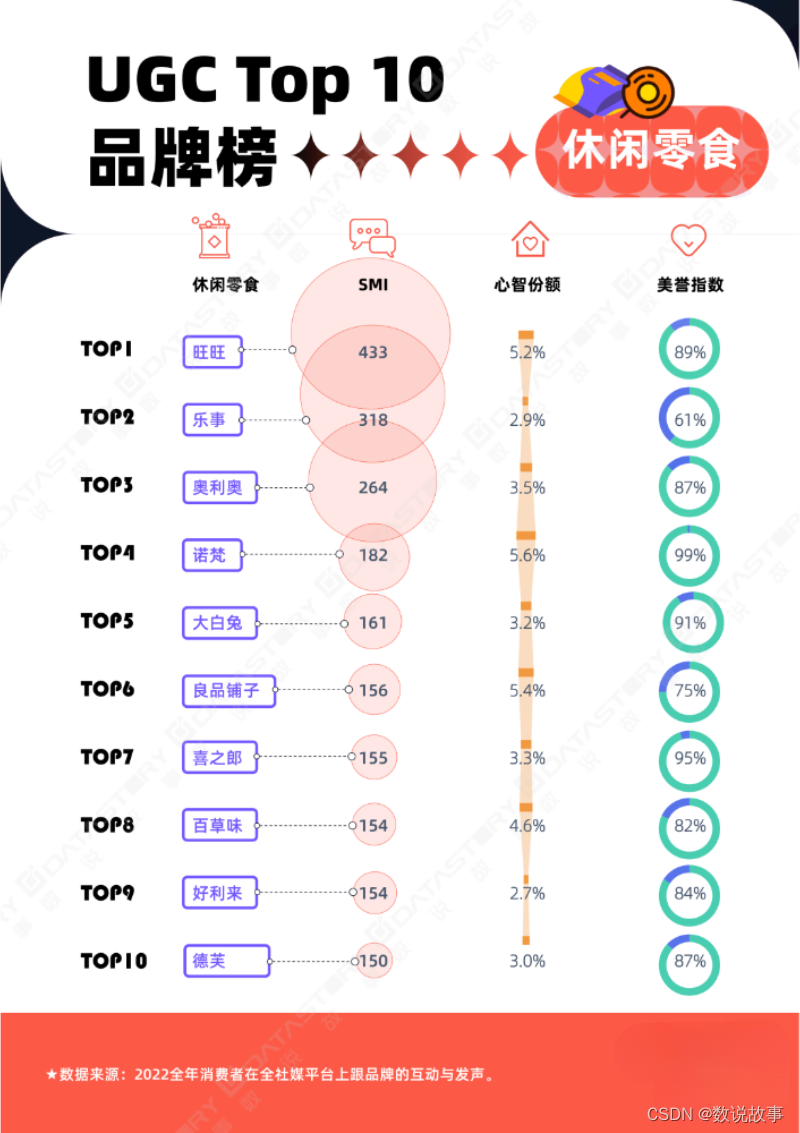 心智驱动行为,行为映射心智,这是让消费者记住你、需要你、喜欢你的基本逻辑。在全域的社媒营销中,从认知到相关,品牌需要做的是激发消费者与品牌互动的兴趣;从相关到喜爱,品牌需要通过场景沟通促使消费者相信品牌能解决需求;更进一步,品牌为消费者提供优质的体验,让消费者对品牌满意,从而触发消费者为品牌发声。数说故事根据消费者的社媒行为,从消费者互动-发声-好评,构建出行业首个社媒心智指数SMI (Social Mind Index),能够多维度综合反应品牌在社媒上对消费者心智的影响力,让品牌更好地听见消费者真实的声音,帮助品牌正确决策。