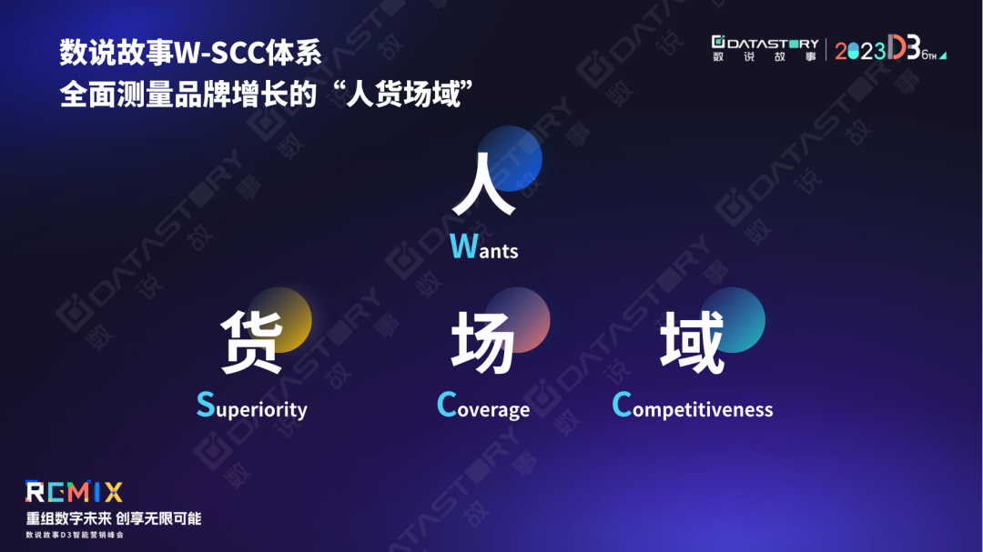 在刚结束的数说故事「REMIX——重组数字未来,创享无限可能」D3智能营销峰会上,数说故事VP孙淑娟发表了以《数“聚”自由,场景重构》为主题的精彩演讲,演讲中数说故事重磅提出围绕“人、货、场、域”的「数说故事 W-SCC 测量体系」,真正全面性地解决品牌营销量化实效的问题。