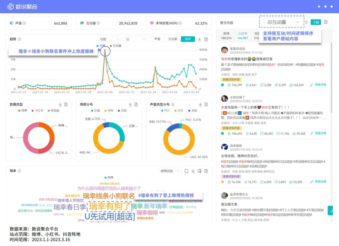 让我们再次打开数说聚合的实时分析看板,依旧以瑞幸咖啡为例,2月6日品牌的声量及话题量冲上巅峰,通过联动原文可以发现当天品牌联合线条小狗IP,完成了一次成功的新品上市活动,#瑞幸有狗了登上微博热搜榜,创下1500w的话题阅读量,可见在这次事件中,可爱的修狗画风击中大部分消费的喜好,同时也调动了情人节继续苟住的单身贵族(gou)们的情绪,帮助品牌实现与消费者的情感链接。