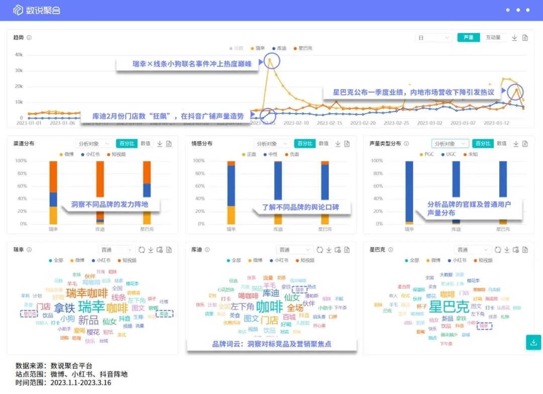以瑞幸咖啡为例,我们查看了其近三个月的微博、小红书、抖音阵地的数据趋势,发现品牌词云中共同出现的还有星巴克、库迪两个咖啡品牌,将这两个品牌加入对比分析,可以看到瑞幸也成为这两个品牌的主要对标对象。同时,透过词云我们还能看到不同品牌的营销动作,如瑞幸与线条小狗的联名事件,库迪的新店8.8元促销活动等。
