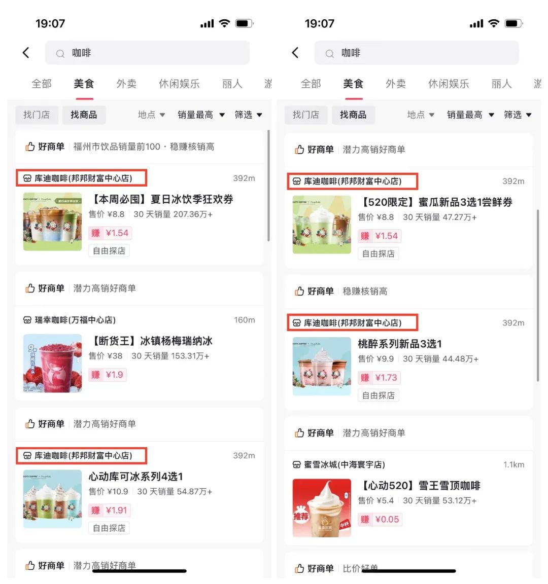 随机抽取身边的咖啡店,库迪咖啡主打商品夏日冰饮36款选18块8狂欢券,30天内就卖出207万+张,排行第一。