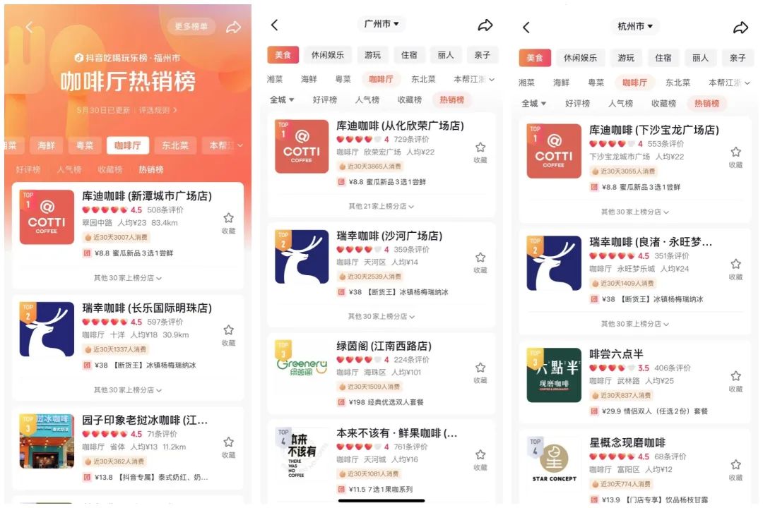 今天在抖音本地生活热销榜,大家可以看到,库迪咖啡已经长期霸占广州、杭州、福州等二十多个城市咖啡热销榜第一。