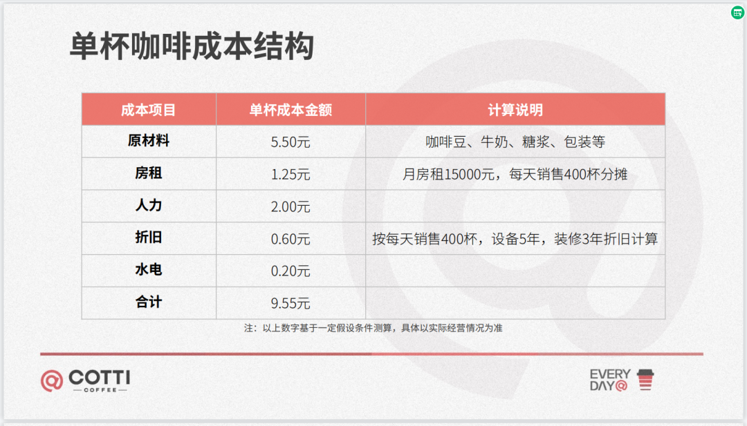 一杯库迪咖啡的原材料成本在5块5。按照杯日均400杯的一个杯量来测算的话,房租的成本分摊下来大概是1块2毛5一杯。人工成本大概在两块钱左右,然后再加上两毛钱左右的水电杂费。