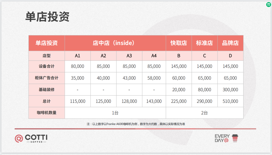 比如说,开一家库迪店中店需要投资 11.5-14.3 万元,外加保证金 3 万元;稍大一些的快取店、标准店则需要分别投资 22.5 万元、29 万元,而品牌店投资则达到 51 万元。