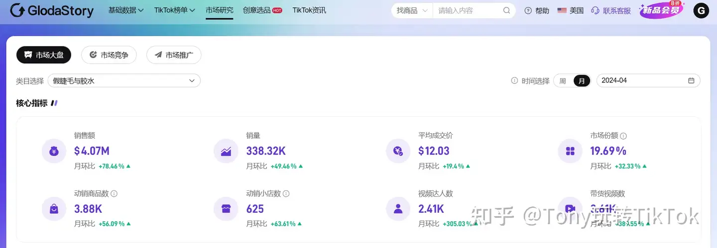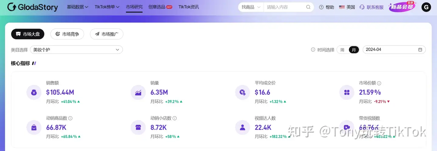 以Tik Tok市场份额最大的美妆个护品类为例,GlodaStory显示2024年4月美妆个护大盘环比增长59.34%,GMV $100.37M,无疑是红海市场。