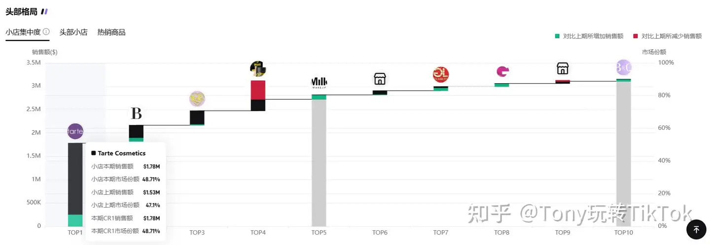 细看二级品类,美妆套装品类的市场份额最高,占比40.9%,增速187.12%也很高,好像很值得入局?但再细看市场饱和度和竞争情况,发现单单一个头部小店Tarte Cosmstics就占了84.71%的销量,根本打不过,如果没有优质的货源、低成本打爆款方法,不易入局。