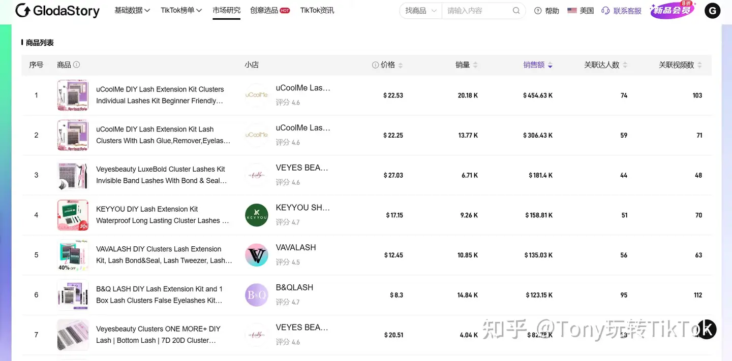 回归假睫毛与胶水这一类目,通过Glodastory对比可以快速发现,同样是假睫毛类目,亚马逊近30天有一款眼部卸妆液商品销量>10k,但TikTok上并未发现同款产品。这款商品已经被亚马逊证明是被美国消费者接受,且能卖爆的,我们可以将这款商品搬到tiktok上售卖。
