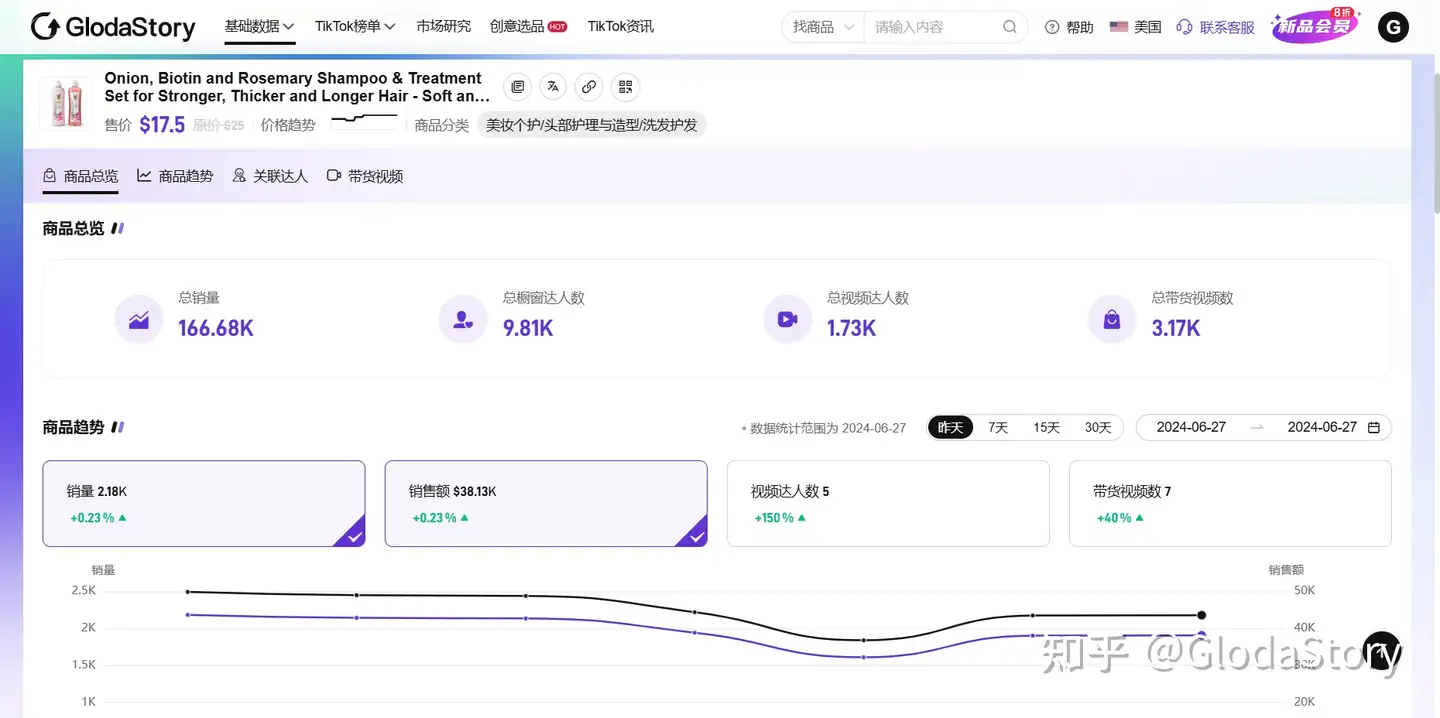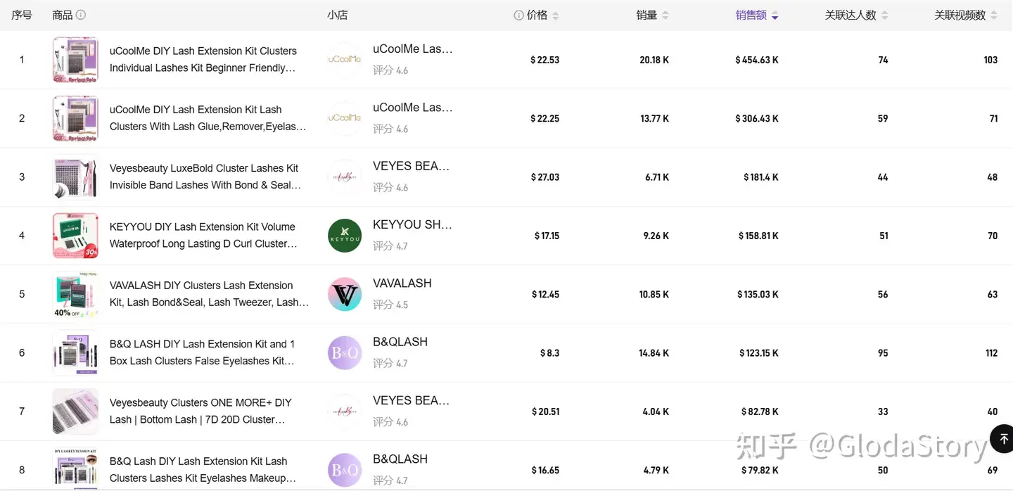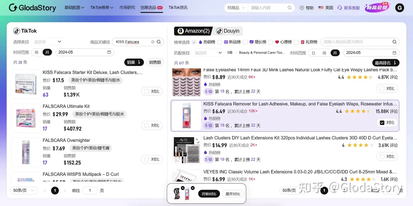 例如在Glodastory上发现假睫毛与胶水品类,在亚马逊有一款眼部卸妆液商品近30天的销量>10K+,但TikTok上未发现同款产品,那么新手卖家可以将这款商品搬到tiktok上售卖。这种跟卖方式,有效的减低亏本风险,而且市场上肯定有成熟的货源与物流供应,入局tiktok的难度大大降低。