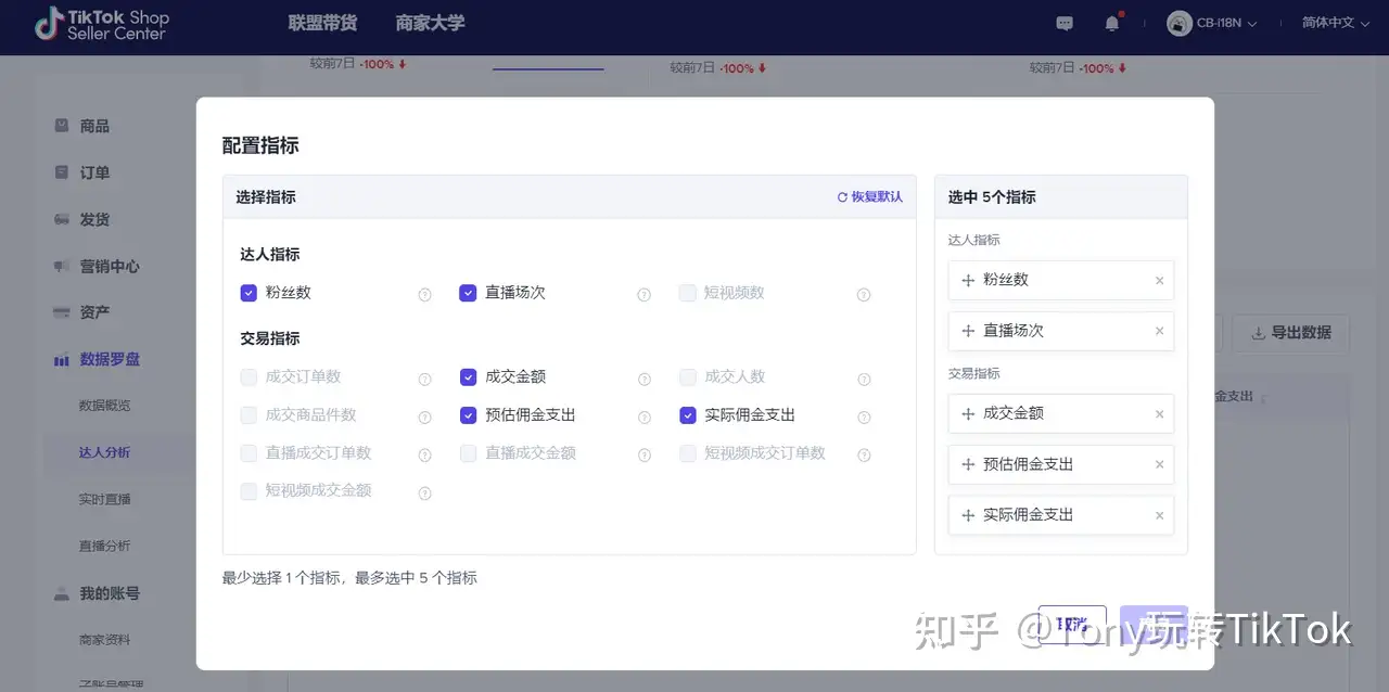 合作达人数、动销达人数、动销商品数、销售额、销量、佣金支出、粉丝数等。