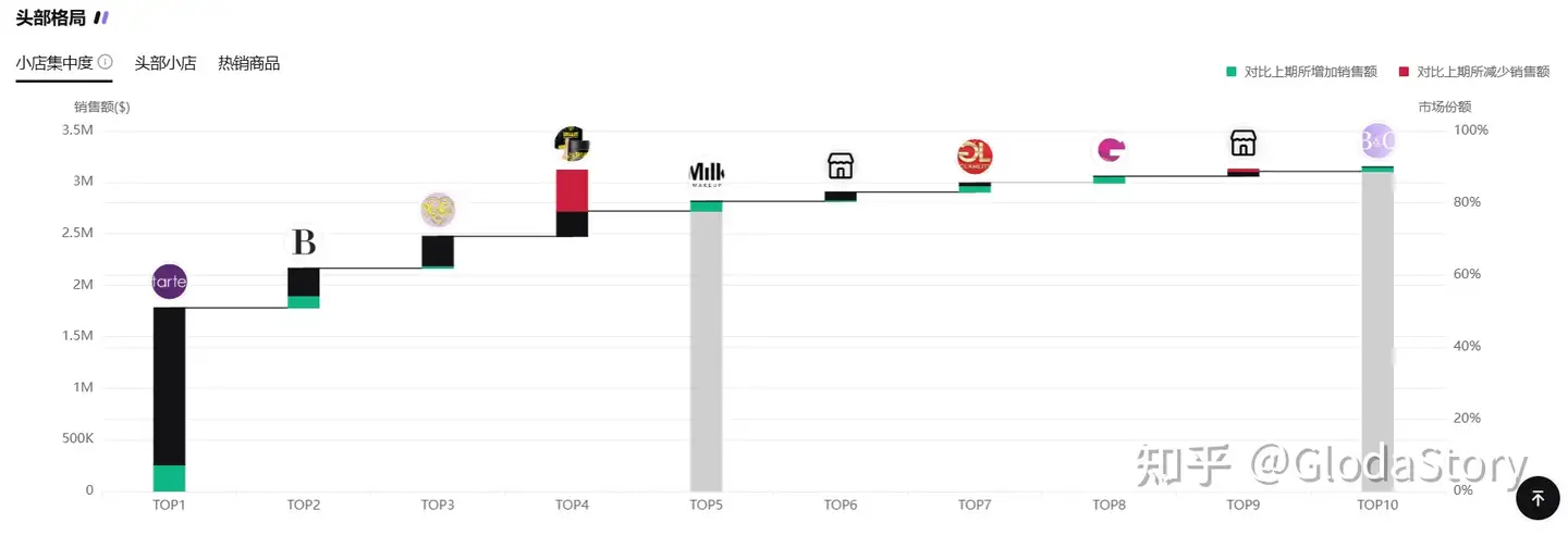 再细看市场饱和度和竞争情况,发现单单一个头部小店Tarte Cosmstics就占了48.71%的销售额,TOP 10小店占据了95%+的市场份额,竞争十分大,如果没有优质的货源、低成本打爆款方法,不易入局。