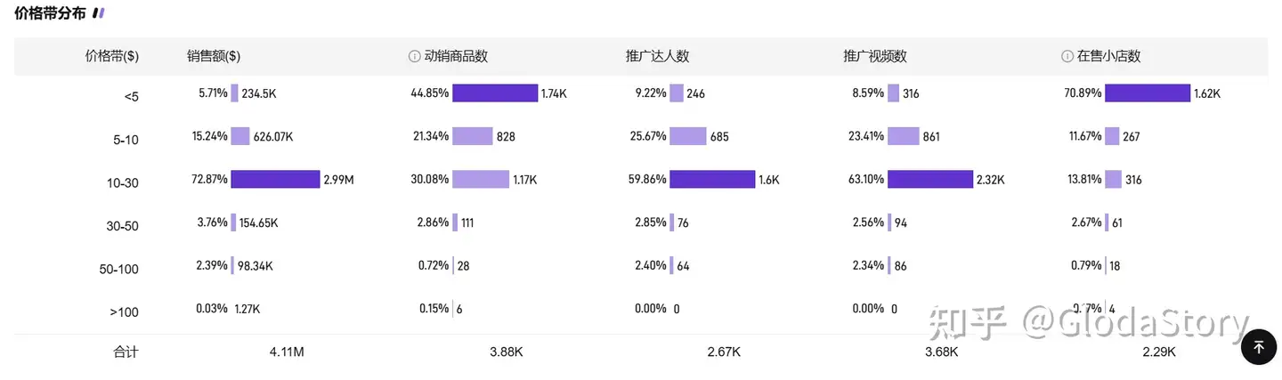 商品价格带:查看商品的价格带分布,找到高销量的价格区间,选品一定要符合TikTok用户的购物预期和预算,选价格太高的商品,销量难以做大。