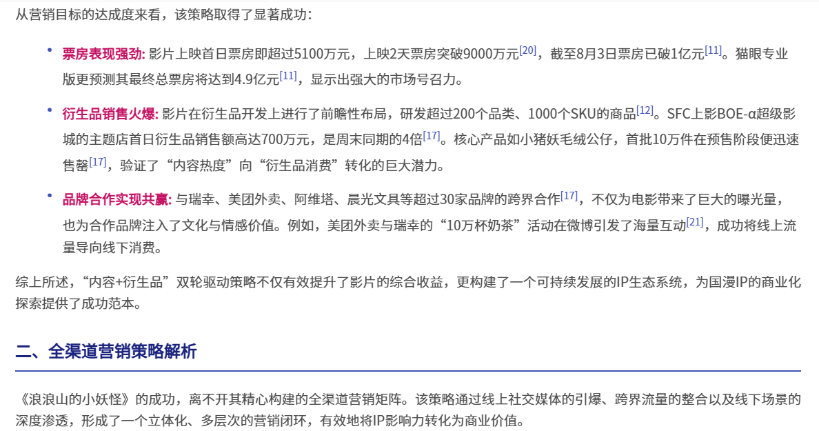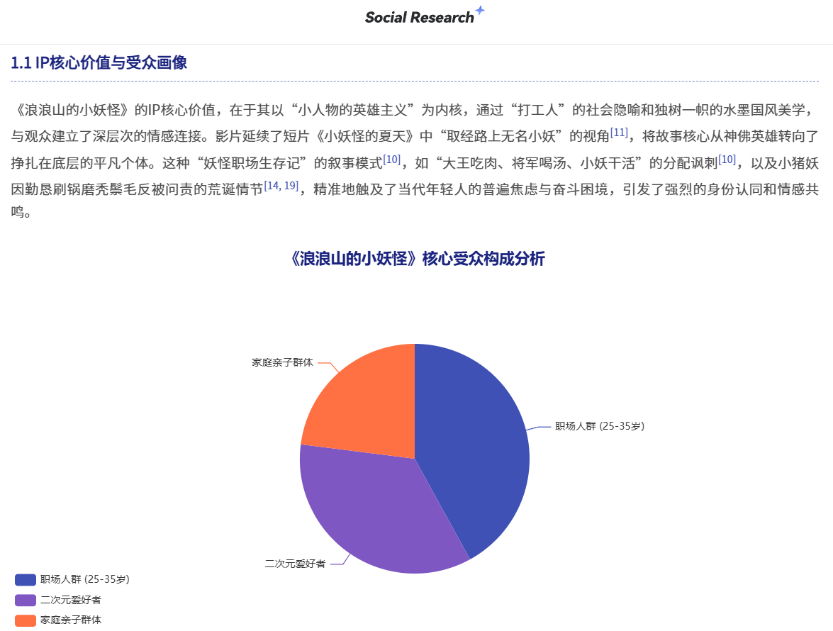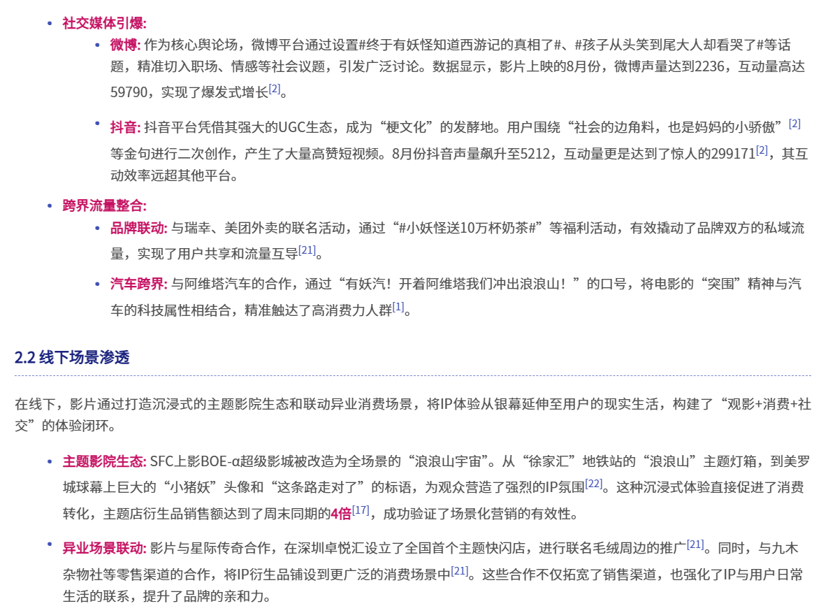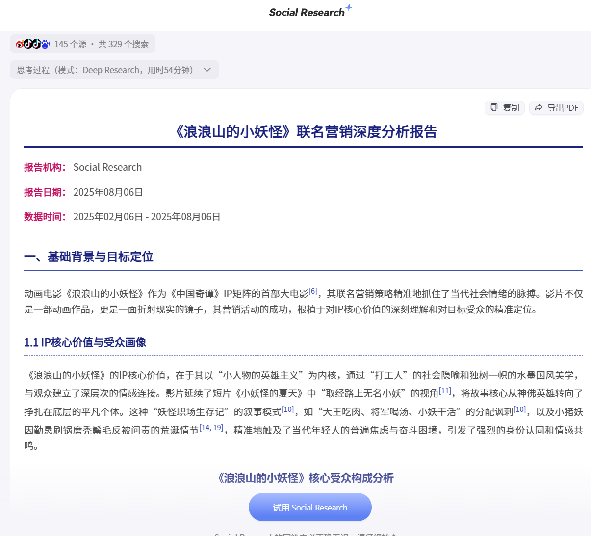 以近期热门的动画电影《浪浪山小妖怪》联名为例,Social Research 通过调用全网社媒声量、用户评论、票房数据等多维数据,系统自动规划分析路径,20分钟内生成包括背景定位、渠道策略、用户情感、竞争对标等在内的完整报告框架,并辅以丰富的图表可视化,如票房趋势图、声量互动走势、NSR情感分析等,直观呈现营销效果。