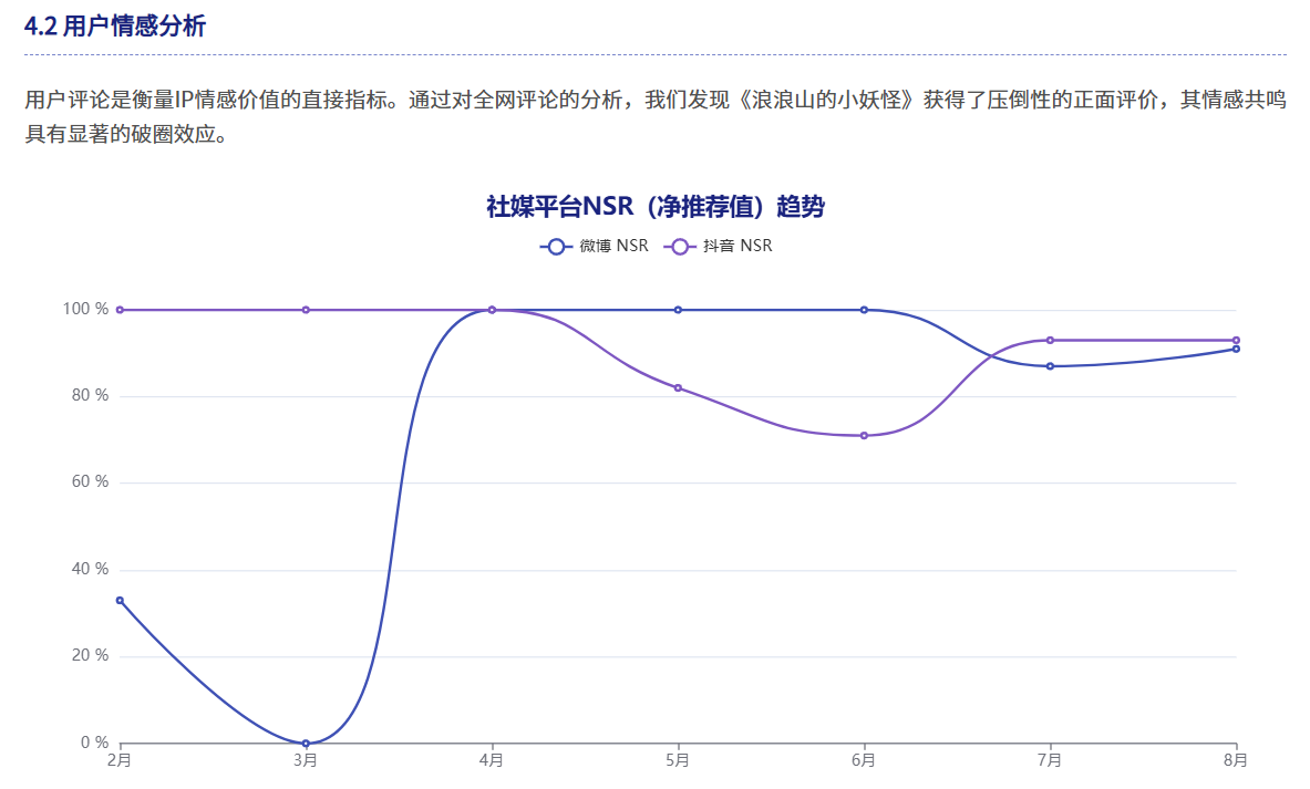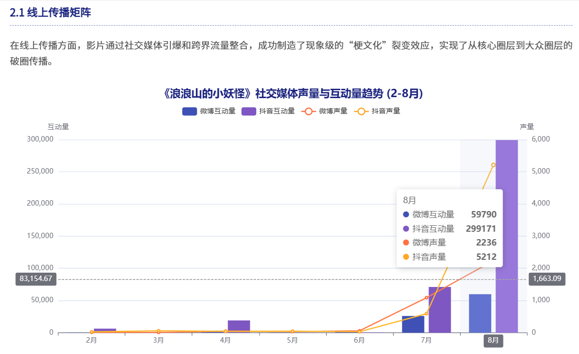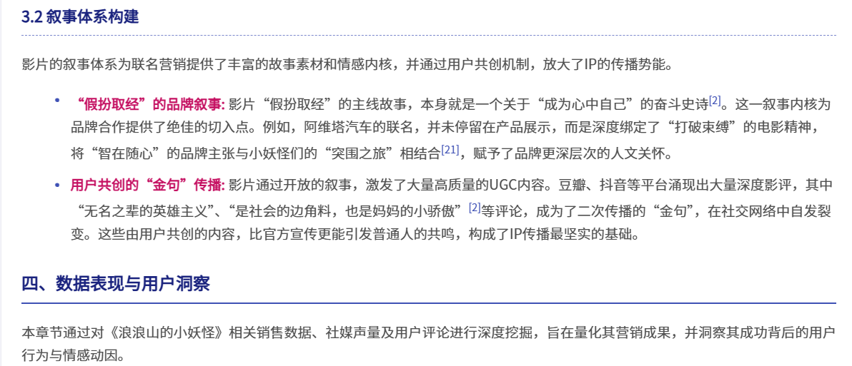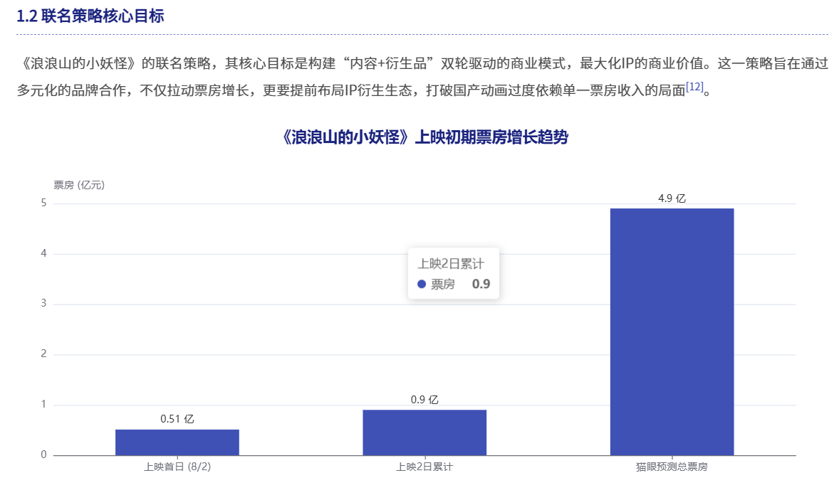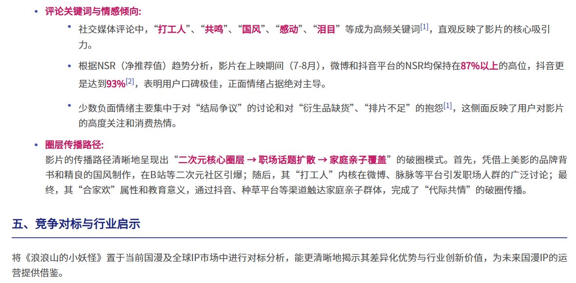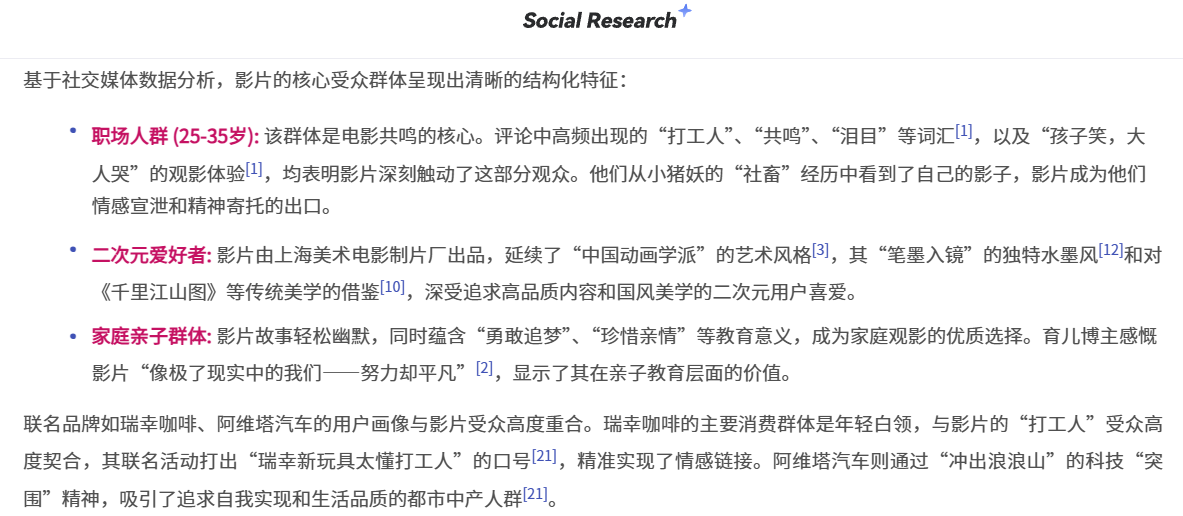 以近期热门的动画电影《浪浪山小妖怪》联名为例,Social Research 通过调用全网社媒声量、用户评论、票房数据等多维数据,系统自动规划分析路径,20分钟内生成包括背景定位、渠道策略、用户情感、竞争对标等在内的完整报告框架,并辅以丰富的图表可视化,如票房趋势图、声量互动走势、NSR情感分析等,直观呈现营销效果。
