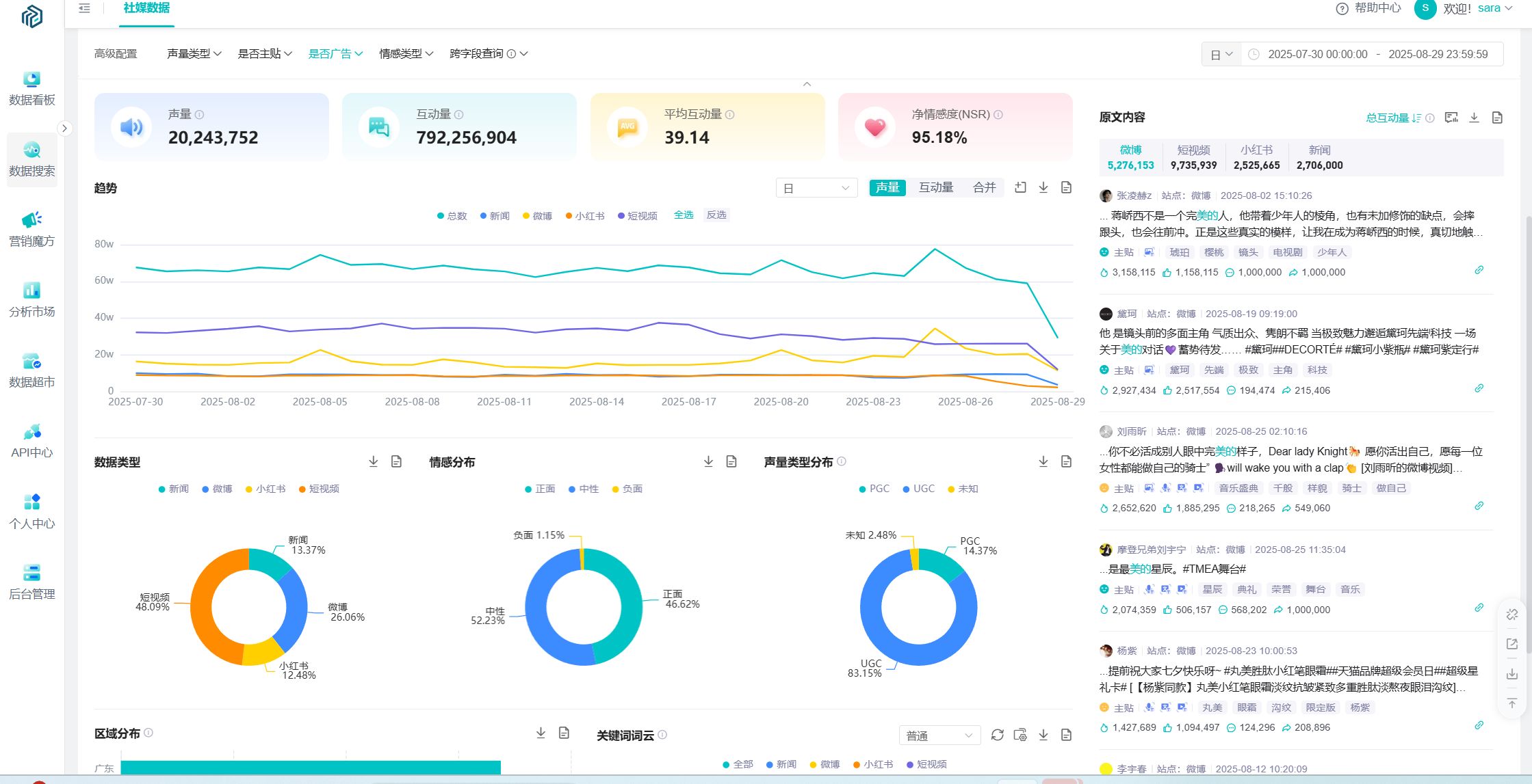 - 维度深:数说聚合支持按关键词、指定账号、指定主贴URL等多种方式查询数据,适合品牌监测特定KOL合作声量或竞品营销布局等场景。