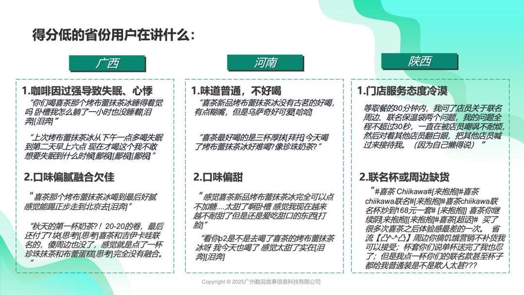 而广西、河南、陕西等低得分省份的用户反馈,主要集中在产品适配性与服务细节的优化空间。产品层面,广西部分用户提及咖啡因含量对睡眠产生影响,且烤布蕾与抹茶的口感的“默契融合度”有待加强;河南用户反馈甜度适配难“对味”,部分人认为口味辨识度可提升,与区域茶饮品牌的同类产品相比,存在调整空间。陕西用户提到咨询联名周边时,服务响应的流畅性有待提升,联名杯、周边节奏也需更贴合用户需求,此外还存在周边被溢价转售情况。