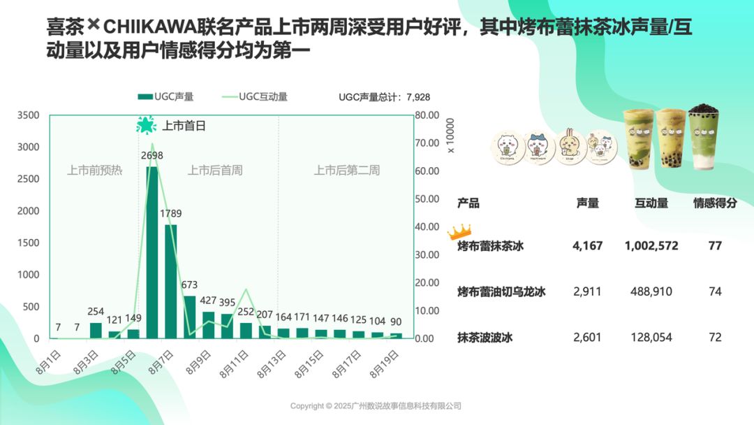 从产品维度来看,「烤布蕾抹茶冰」是此次联名的新品王者,在声量、互动量、情感得分上均为第一,烤布蕾系列两款新品的声量和互动量,均远超限定返场的“抹茶波波冰”,且 “抹茶 + 烤布蕾” 的 “双新品成分” 组合,互动量是 “乌龙 + 烤布蕾” 的 2.05 倍,扛起了联名热度的 “半壁江山”。