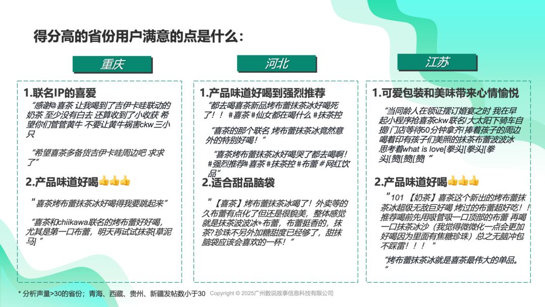 喜茶×Chiikawa 上市期间,根据消费者省份情绪得分发现,情绪得分较高的省份为重庆、河北、江苏,这些省份的用户对新品的正面反馈更集中;青海、西藏等也在高分组省份行列,因喜茶门店仅 3-5 家、茶饮选择稀缺,用户对 “顶流 IP + 头部品牌” 的新鲜感拉满,正面占比同样偏高;而茶饮品牌超100个的上海,古茗茶百道遍地的广西、河南等地区,横向对比其他品后评价“降温”,整体情绪得分相对较低;北京、广东等中分组,虽门店密集,但用户对喜茶品质有基础信任,整体人群基数也高,情绪得分不偏不倚。