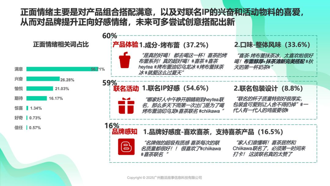 “烤布蕾抹茶冰” 正面情反馈中,“满意”、“兴奋”、 “愉悦”三大关键词占据主导。好评两大核心源自“产品力”和“IP共鸣”。产品体验层面,“烤布蕾” 成分创新贡献 37.2% 的正面反馈,填补奶茶口感层次空白,“抹茶 + 布蕾” 的神仙搭配更让茶香与奶香完美融合,收获 33.6% 的正面认可。品牌感知层面, “电子布洛芬”Chiikawa让无数用户沦陷,54.6% 为Chiikawa IP 萌感买单,8.8% 认可联名物料,舍不得扔联名杯。更有16% 的用户为喜茶的 “爆款制造力” 盖章,直言 “每次联名都精准踩中喜好”,品牌好感度一路 up。