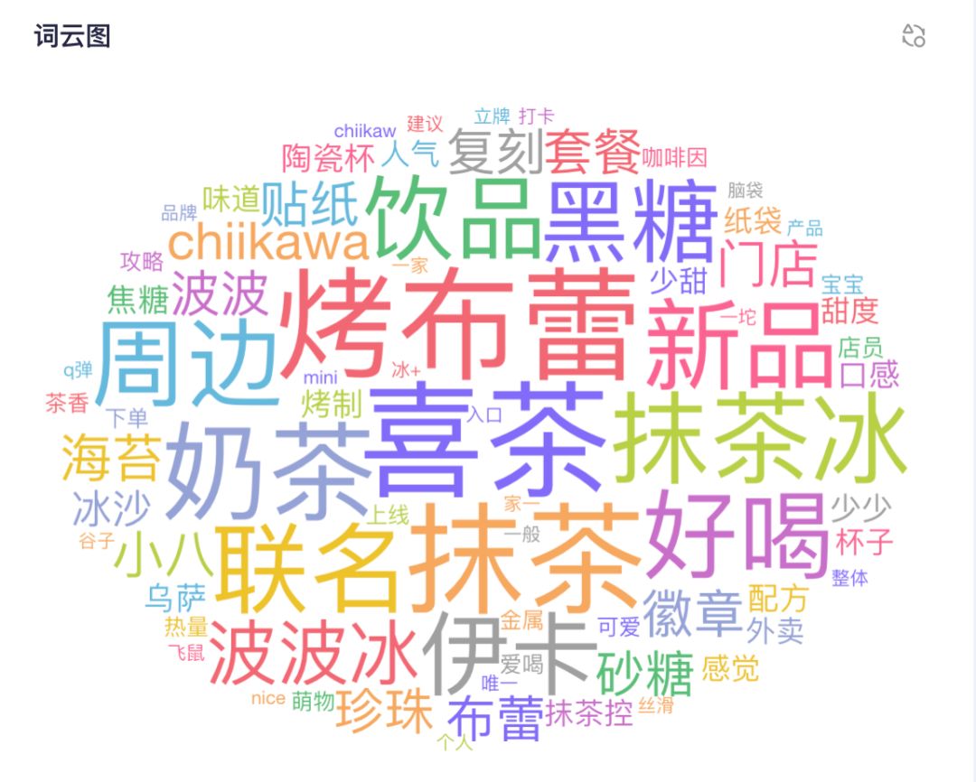 奶茶搭配限定吧唧,精准戳中“吃谷”人的心,“徽章”、“陶瓷杯”、“贴纸”等IP联名周边被高频讨论,Chiikawa同好们为了集齐周边,特意多次下单或组队拼单。“门店”、“立牌”、“打卡” 等热度也不低,各地主题店布置的 Chiikawa 立牌、剧情场景装置,吸引大量消费者专程到店拍照打卡,让线下也成了传播亮点。