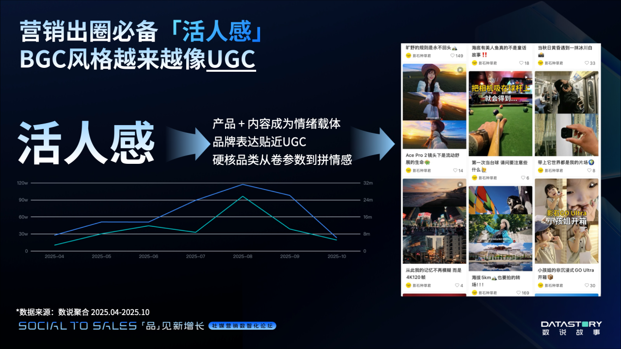 过去品牌做内容,总爱 “端着”,但现在消费者更吃 “真实感”。品牌自己发的 BGC 内容,要是能像用户拍的 UGC 一样接地气,效果会完全不一样。我们看 2025 年 4 月到 10 月的互动数据,“活人感” 内容的热度持续上升,以影石(Insta360)为例,他们的社区特别活跃,他们的内容全是用户真实场景,有人把相机吸在台球杆上拍视角,有人带着它高空跳伞、在海拔 5km 的地方拍转场,还有以 “小孩姐”视角做非沉浸式开箱。“活人感”内容让产品成了情绪载体,连 3C 这种硬核品类,都从 “卷参数” 变成了 “拼共鸣”,这也是影石能快速占领市场的关键。