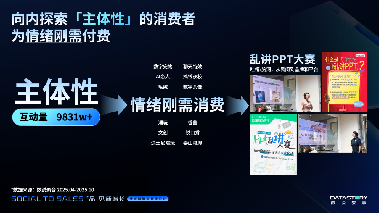 现在的用户,尤其是年轻消费群体,越来越看重 “自己是谁、自己需要什么”,消费不再只看功能,更看能不能填补情绪缺口。数说故事旗下数说聚合的数据显示,2025 年 4 月到 10 月,“主体性”互动量已经超过 9831 万,这是一个非常庞大的市场信号。透过互动数据中UGC内容洞察发现,从数字宠物、AI 恋人到聊天特效、数字头像,这些虚拟的产品,通过满足陪伴感正在围猎年轻人;潮玩、香薰、文创、脱口秀、乱讲PPT大赛等体验和服务,成了年轻人释压的新型途径。