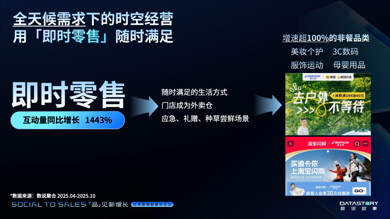 “即时零售” 成了全天候需求的解决方案,随时满足成了新的生活方式。数说故事数据显示,2025年4-10 月,即时零售的互动量同比增长了 1443%,而且不只是外卖,美妆个护、3C 数码、服饰运动、母婴用品这些非餐品类,增速都超过 100%。现在 “门店成为外卖仓” 已经是常态,不管是应急买东西、节日送礼物,还是想尝鲜新商品,大家都希望 “分分钟送到”。