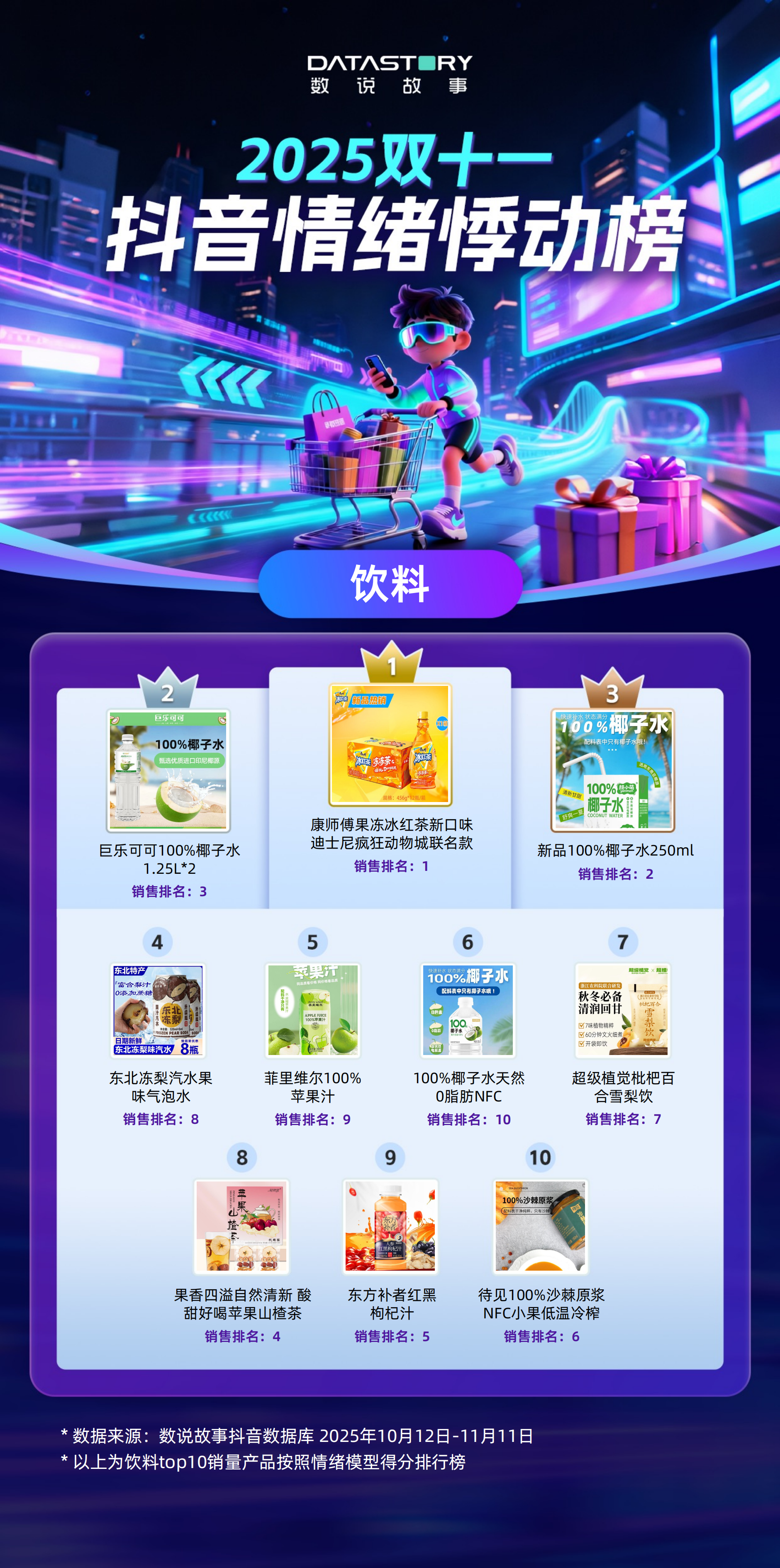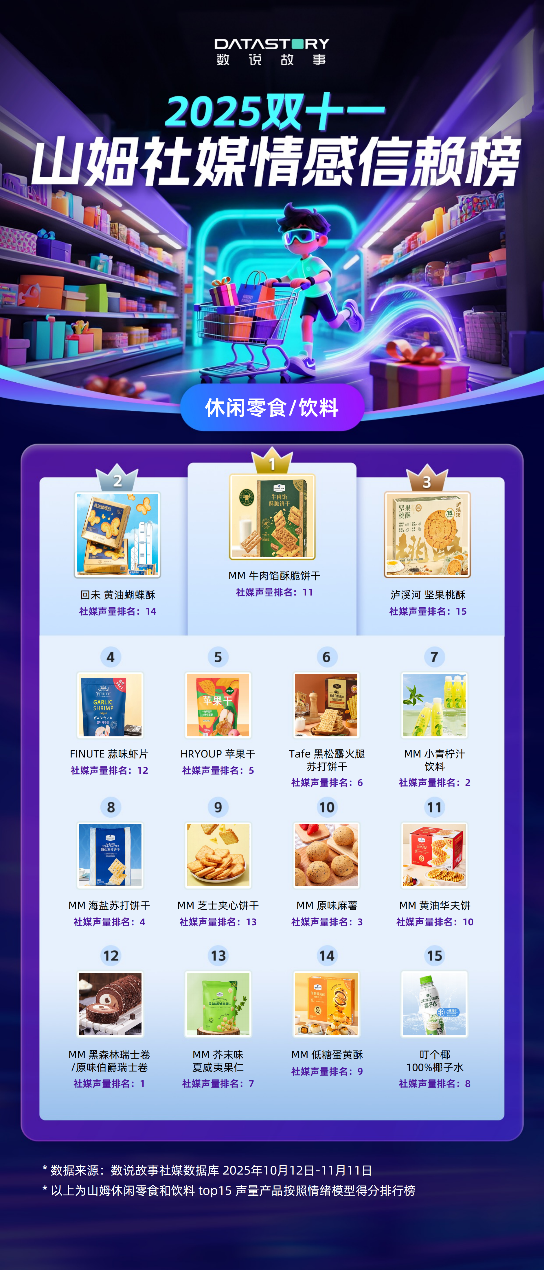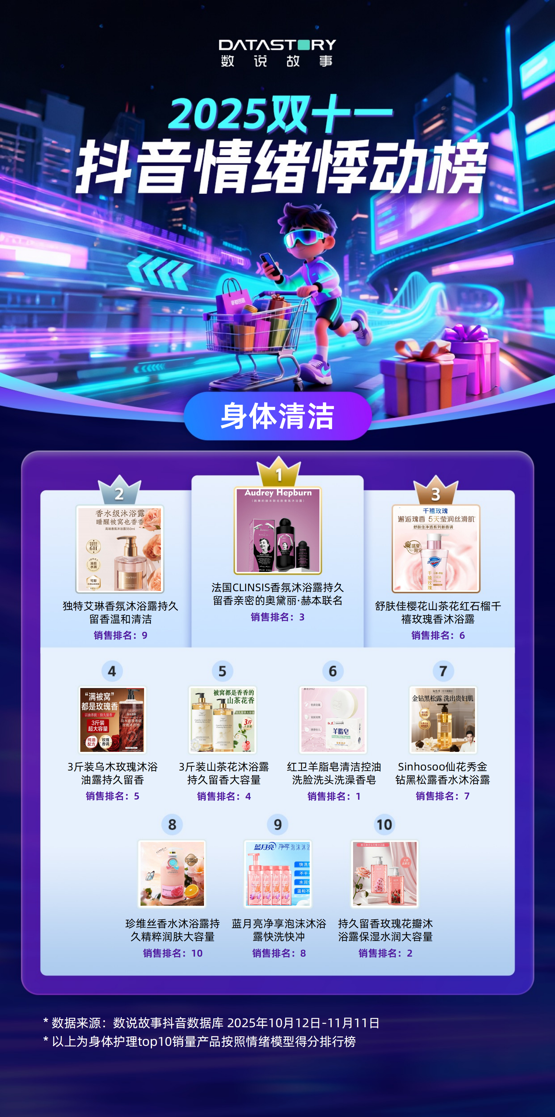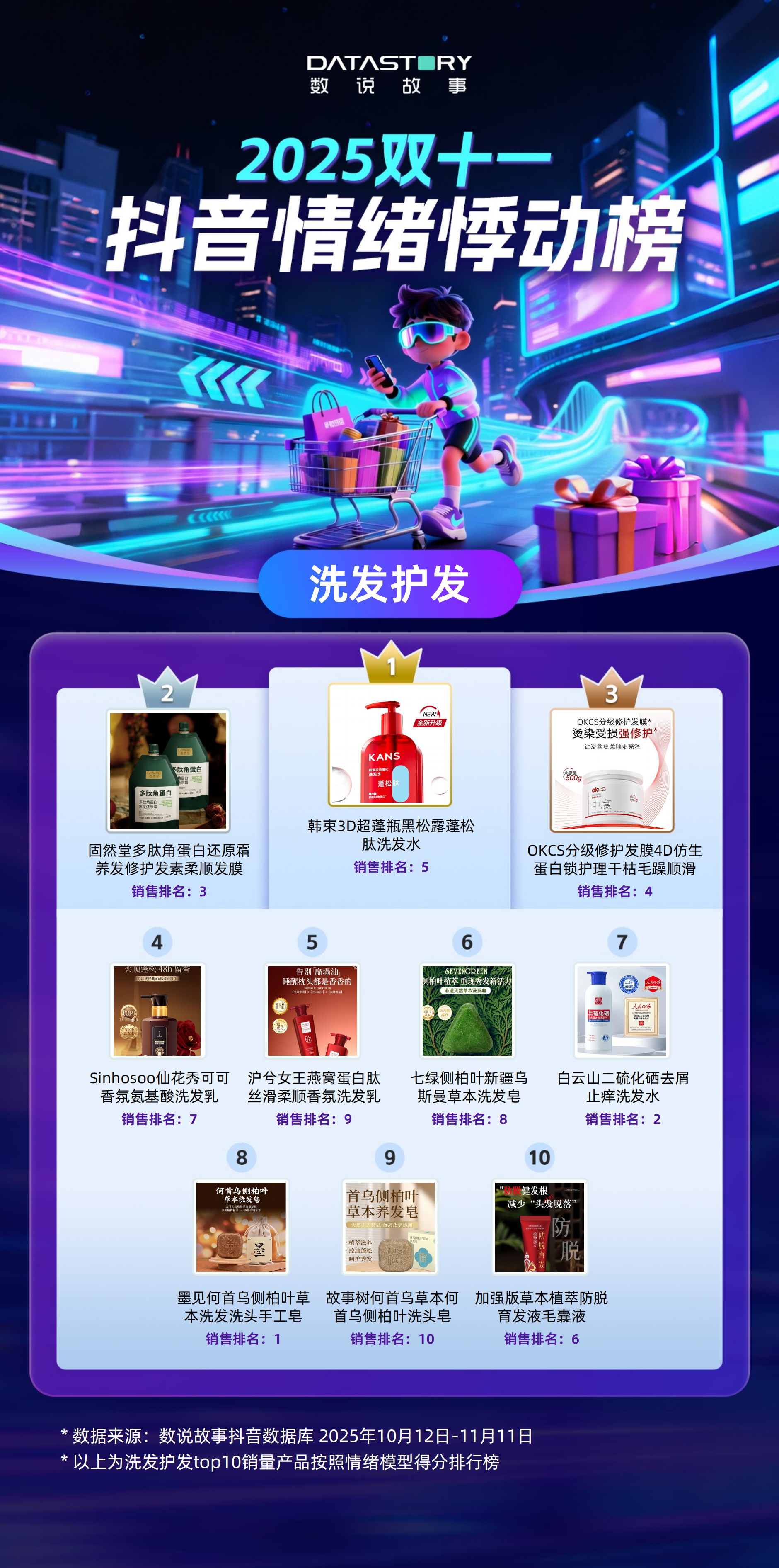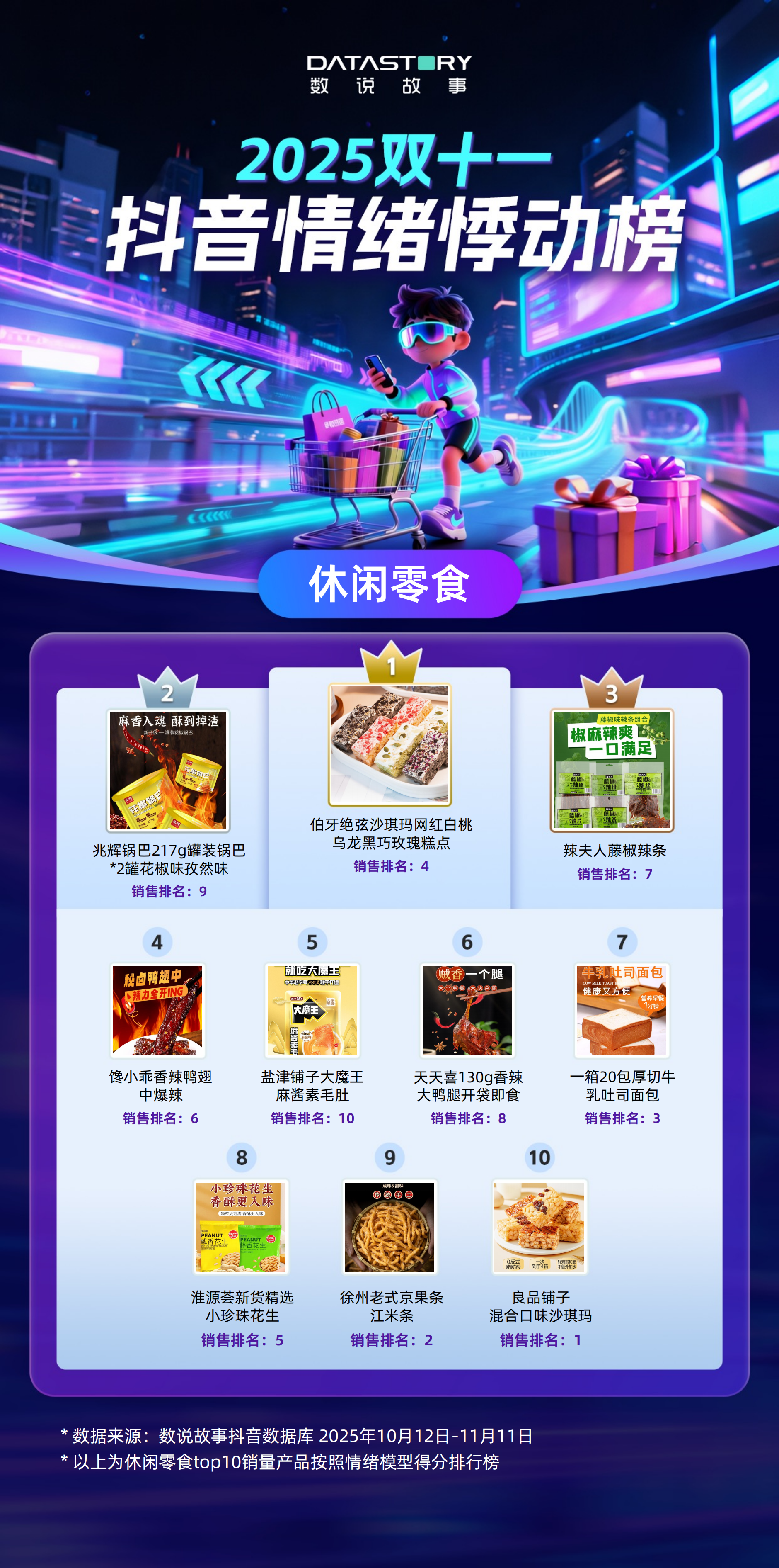 数说故事首发《2025双十一抖音情绪悸动榜》和《2025双十一山姆社媒情感依赖榜》,评选双十一热度产品中的“情绪得分”,这两类榜单也正对应着情绪消费的一体两面: