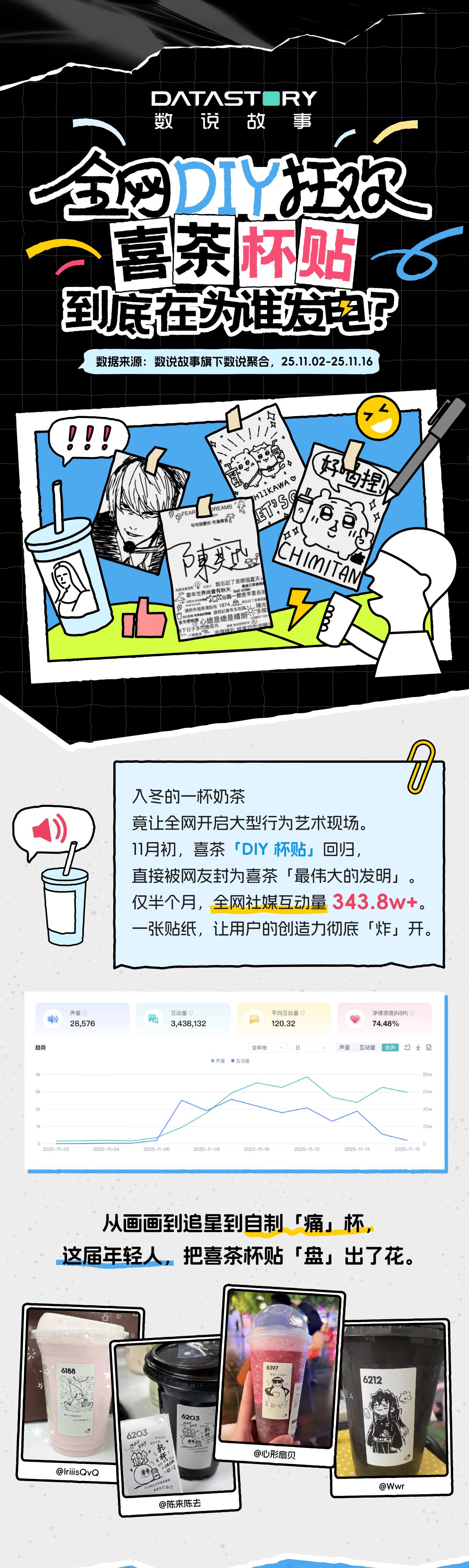 11月初,喜茶「DIY 杯贴」回归,被网友封为喜茶「最伟大的发明」。仅半个月,全网社媒互动量 343.8w+。