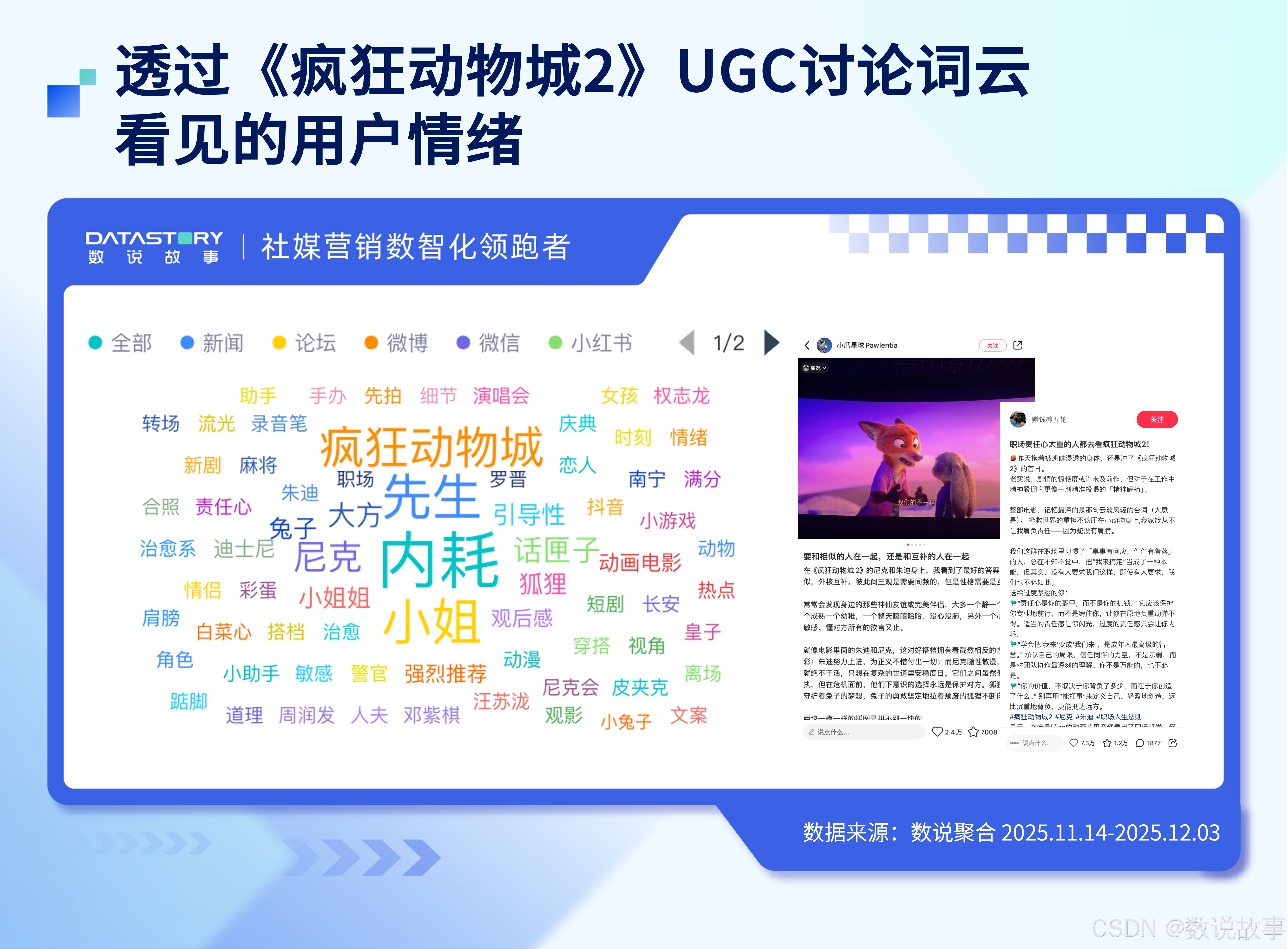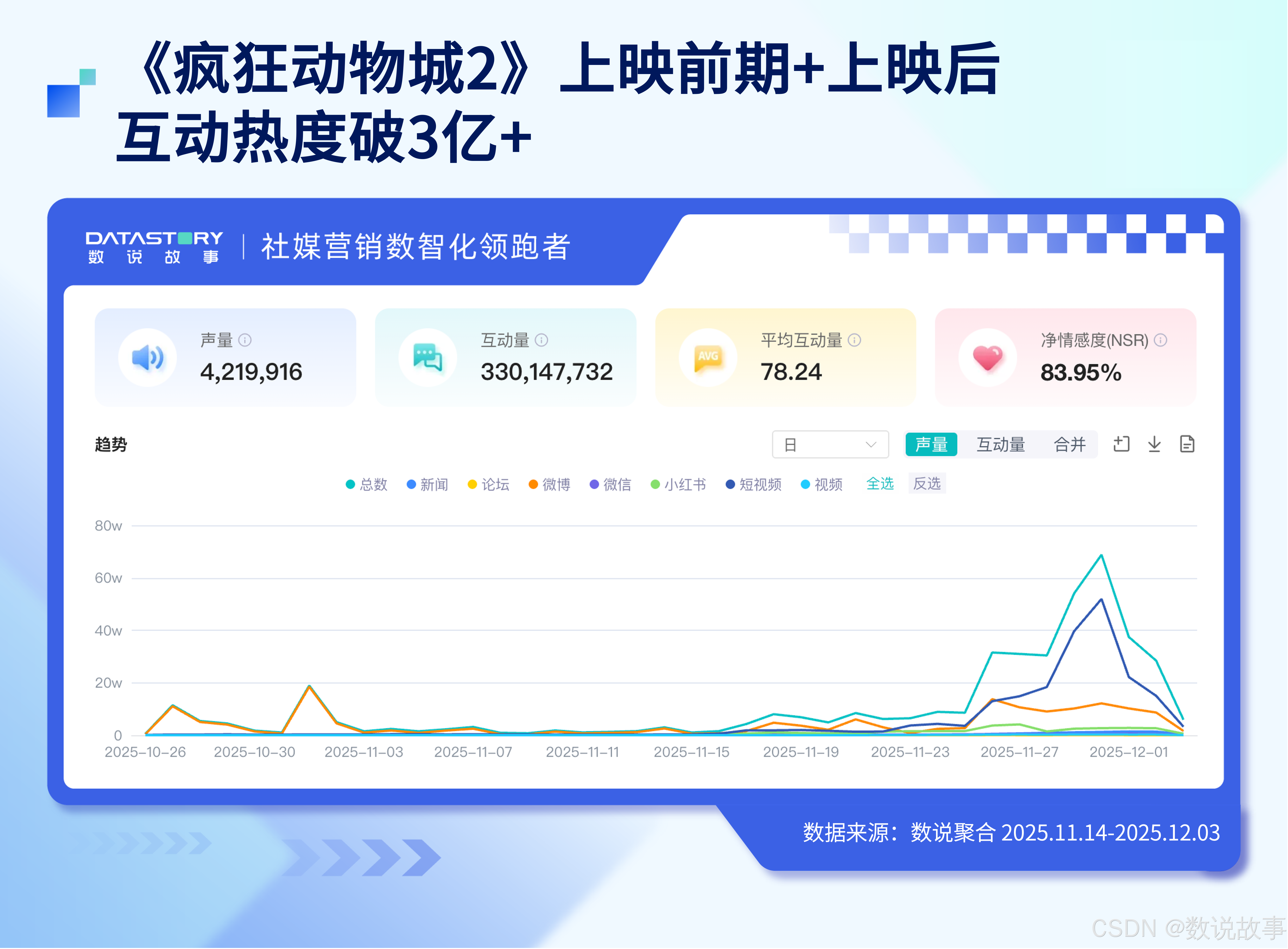 根据数说故事数据,从 2025 年10月开始,围绕影片的讨论量在全网累计突破了421 万,互动总量超过 3 .3亿。影片上映首周即达到声量峰值,微博推动舆论爆发、短视频承载情绪表达、小红书贡献大量“联名使用场景分享”,共同构成了一个 “内容驱动—情绪感染—消费转化” 的完整链路。