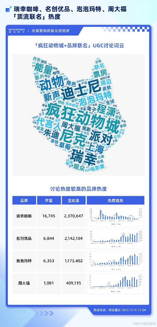 根据数说聚合「疯狂动物城+联名品牌」的UGC讨论数据显示,「瑞幸」「周边」「限定」等在用户讨论中频繁出现,覆盖餐饮、潮玩、服饰、珠宝等各品类的联名产品,将 IP 从银幕延伸至日常生活的每个场景。网友自发晒出联名消费凭证、收藏限定周边、分享 「集邮式」 打卡攻略。