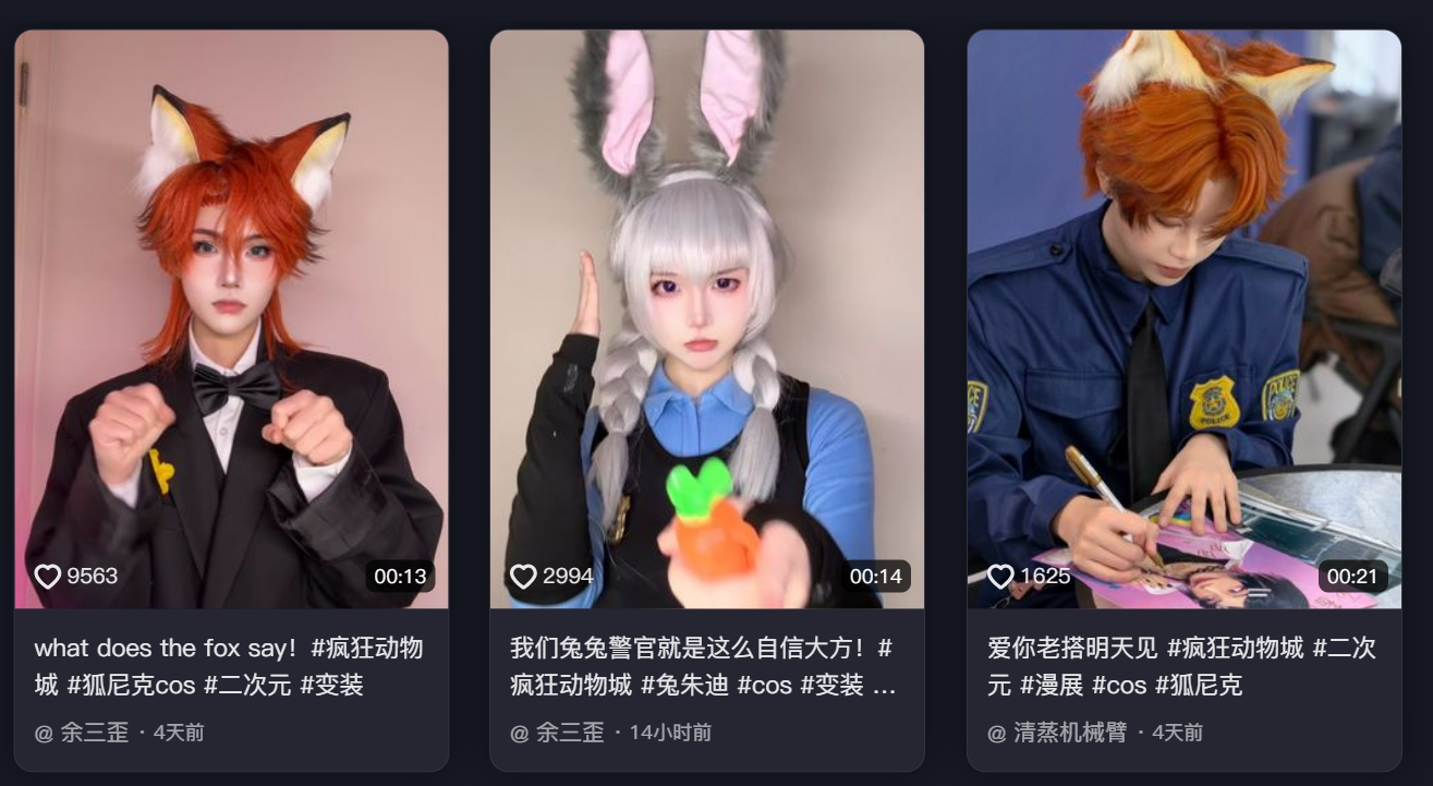● 二创番外,自发“续写”动物城故事。围绕狐兔 CP 的婚后日常、新角色的冒险经历产出系列短视频,有人用方言配音、魔性 BGM 改编经典名场面,甚至推出 “动物城职场生存指南” 等趣味衍生内容。这类爆款的共同点是:场景可复制、情绪可投射、叙事可续写。