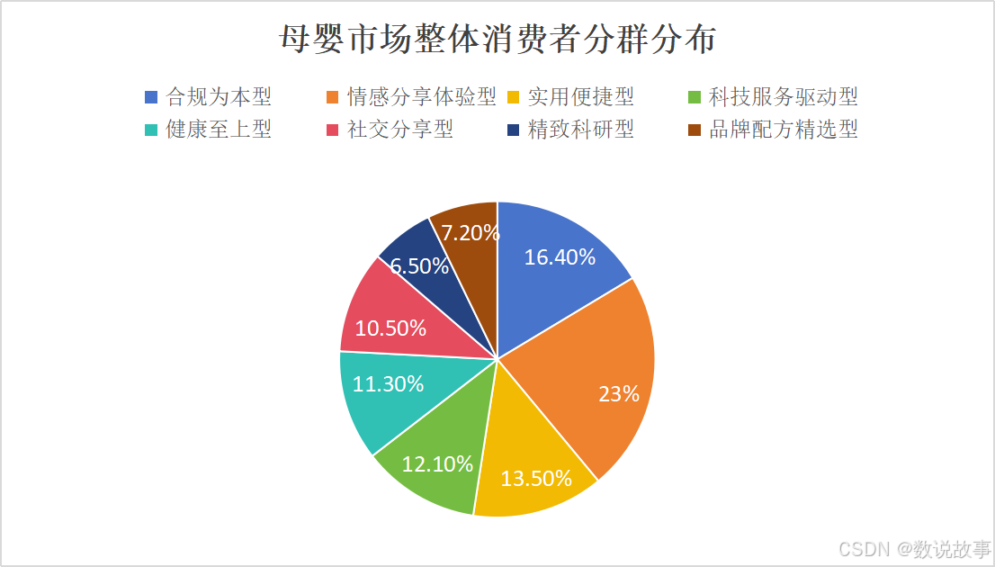 报告中通过潜在狄利克雷分配(LDA)主题建模的深度归因,从海量社媒内容中划分出中国母婴产品消费市场的「8大典型消费人群」覆盖三大需求维度:以合规为本型(16.4%)、实用便捷型(13.5%)、社交分享型(10.5%)为核心的「便捷实惠导向群体」,是市场基础盘;以情感体验分享型(22.6%)、健康至上型(11.3%)为主的「体验感导向群体」,代表消费升级趋势;以科技服务驱动型(12.1%)、精致科研型(6.5%)、品牌配方精选型(7.2%)构成「专业性导向群体」。