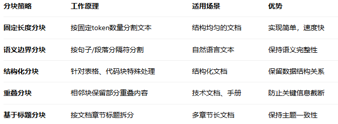 知识分块是将原始文档切割成适当大小文本片段的过程。常用的分块策略包括固定长度分块(如每200字一个块)、语义边界分块(基于句子或段落分隔符)、结构化分块(针对表格和代码等特殊内容)以及重叠分块(相邻块之间有10%-20%重叠,防止关键信息被截断)。