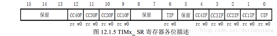 最后,我们要介绍的寄存器是: 状态寄存器(TIMx_SR)。该寄存器用来标记当前与定时器相关的各种时间/中断是否发生。该寄存器的各位描述如图