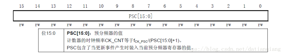 接下来介绍预分频寄存器(TIMx_PSC),该寄存器用设置对时钟进行分频,然后提供给计数器,作为计数器的时钟。该寄存器的各位描述如图所示;