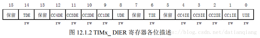 接下来介绍DMA/中断使能寄存器(TIMx_DIER)。该寄存器是一个16位的寄存器,其各位描述如图所示: