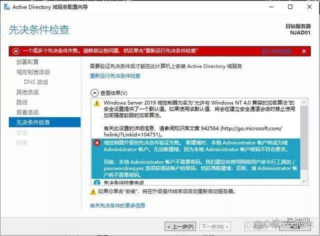 这个报错,就是说域服务器的本地Administrator帐户要升级成域Administrator帐户了,之前设置的密码太简单了,需要重新设置一下。