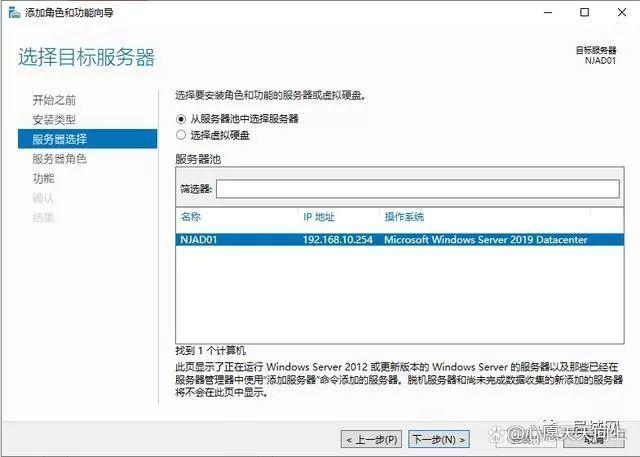 7、“从服务器池中选择服务器”,现在只有一台,所以默认就选择NJAD01,下一步。