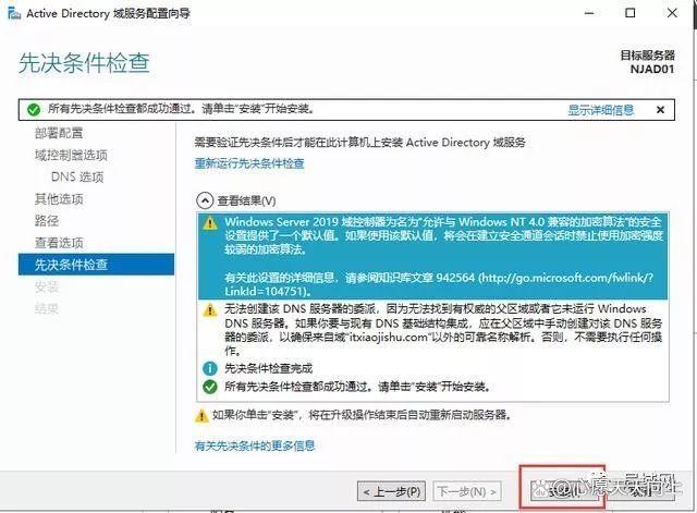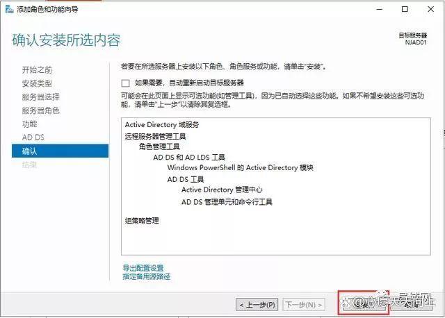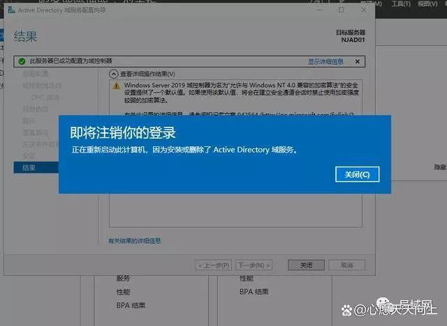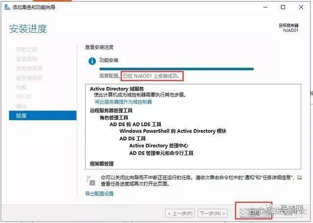 15、看到已在NJAD01上安装成功,说明AD域的角色添加成功了。那是不是AD域现在就配置完成了呢?