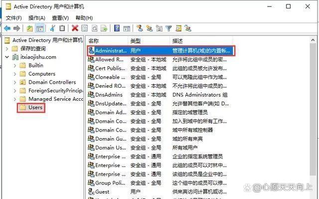 32、进入“Active Directory用户和计算机”后,找到Users可以查找到Administrator等用户。