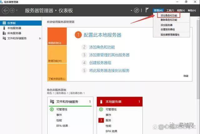 4、打开服务器管理器,找到右上角“管理”--“添加角色和功能”。