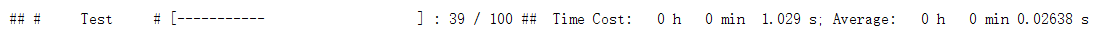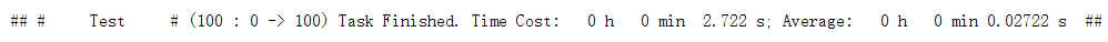 它有一个名字(“Test”)、有总任务数和已完成任务数、有总耗时和单个任务平均耗时、还有一个“进度条”。所有这些在整个程序运行过程中都是在一行内输出的、也就是说它不会产生多行输出(如果屏幕够宽的话)。所有任务完成后,进度条会变为: