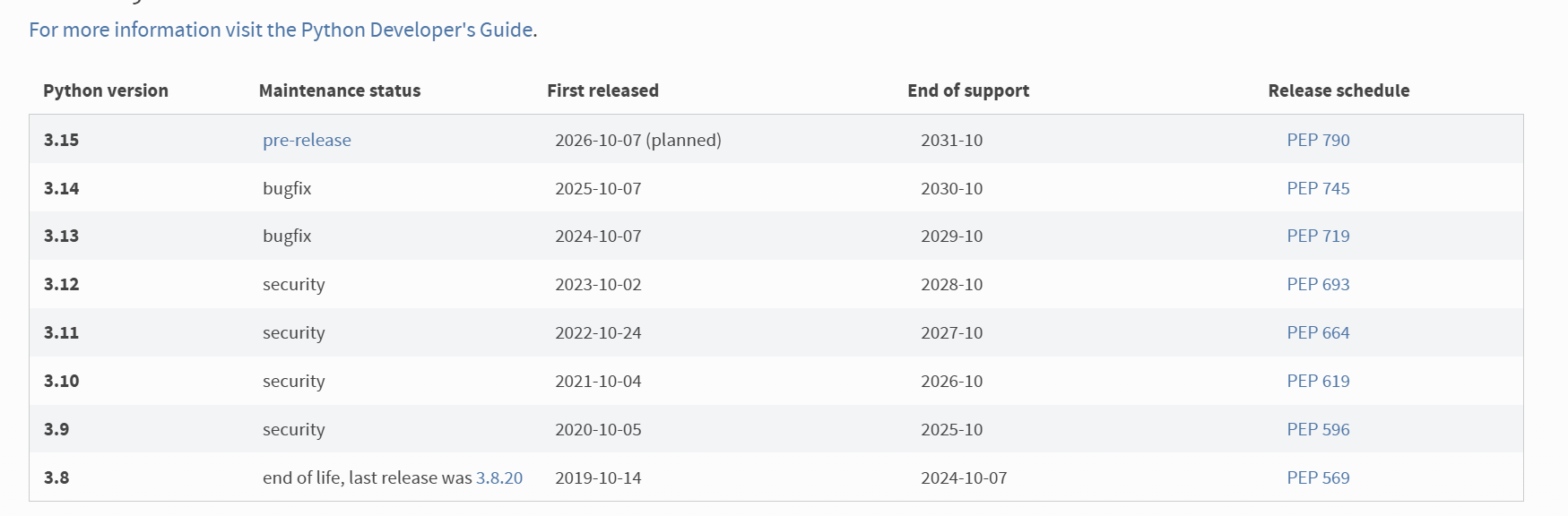python可以去官网下载(Download Python | Python.org),官网上各版本的维护状态分别为:pre-release, bugfix, security, 其中pre-release是预发布版本,含有Python最新的特性,适合学习者使用,bugfix是pre-release和security之间的过渡状态,还有bug需要修复,一般用的比较少,security是安全版本,支持的时间长度也比较长,通常在生成环境使用,目前python各版本的维护状态如下所示: