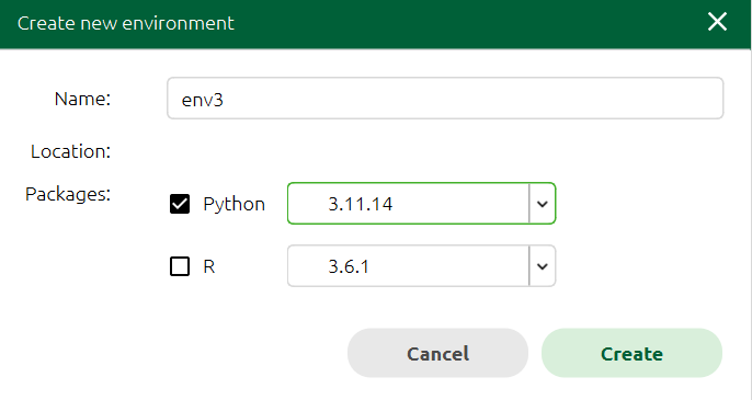 弹出创建虚拟环境对话框,填写名称,选择python版本,点击确定即可