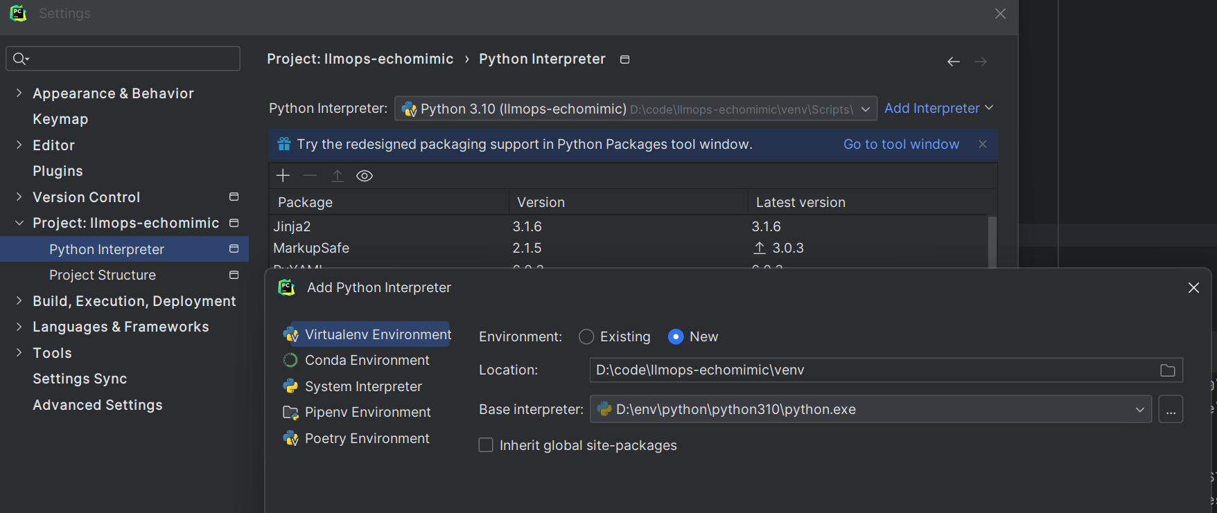 python开发常用的开发工具是pycharm, pycharm下载并安装完成之后就可以往项目中引入python编译环境,setting->Project选择自己的项目->add local Interpreter,可以通过Virtualenv Environment也可以通过Conda Environment的方式