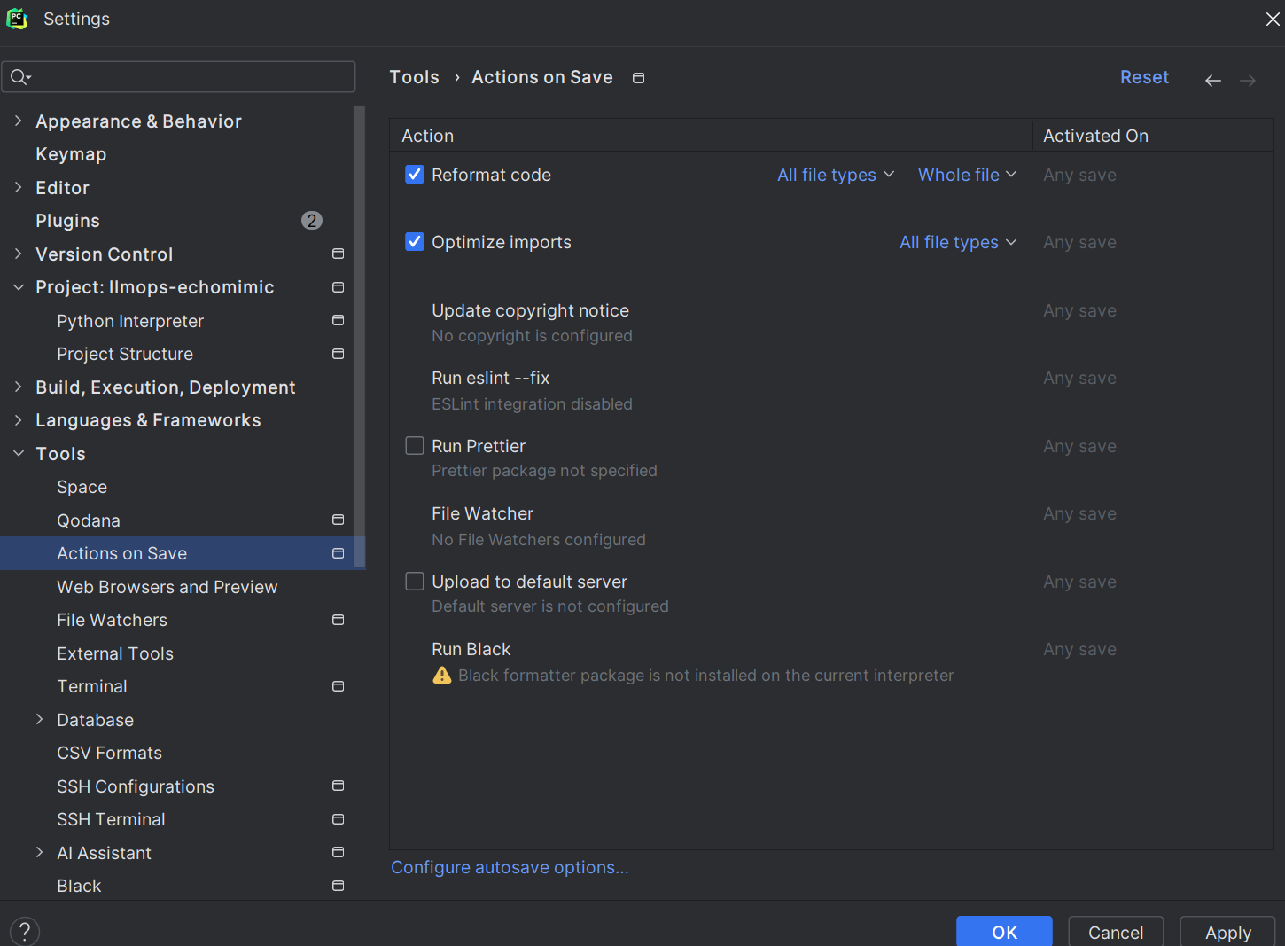 Action on save 中勾选Reform code 和 Optimize imports,Reform code 在保存的时候对代码进行格式化,Optimize imports优化导入文件。