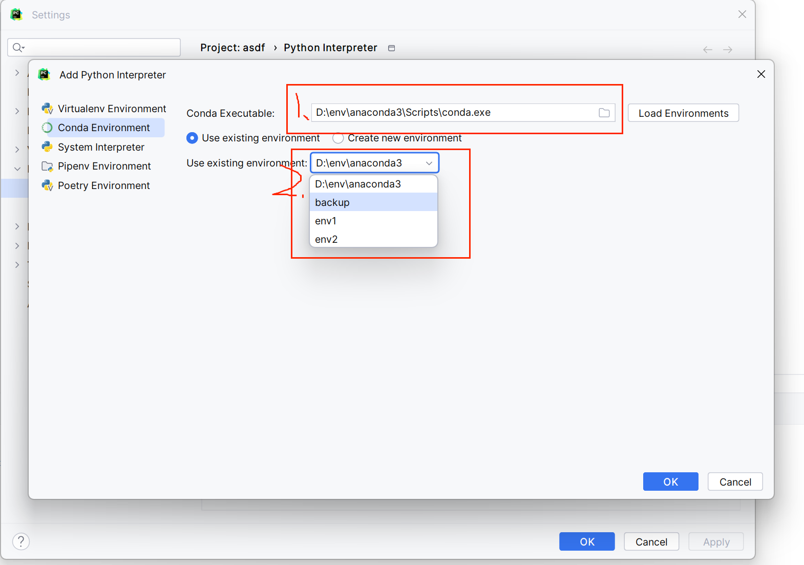 在下图1的位置设置anconda.exe的目录,设置完成后就会在2的位置下拉框中有anconda目前已有的python编译器环境如下,选中要添加的编译器环境,点击ok即可完成