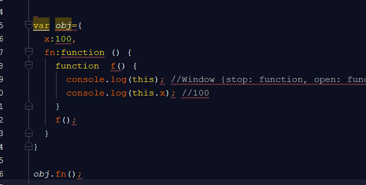这里要注意一个情况:函数f虽然是在obj.fn内部定义的,但是它仍然是一个普通的函数,this仍然指向window。