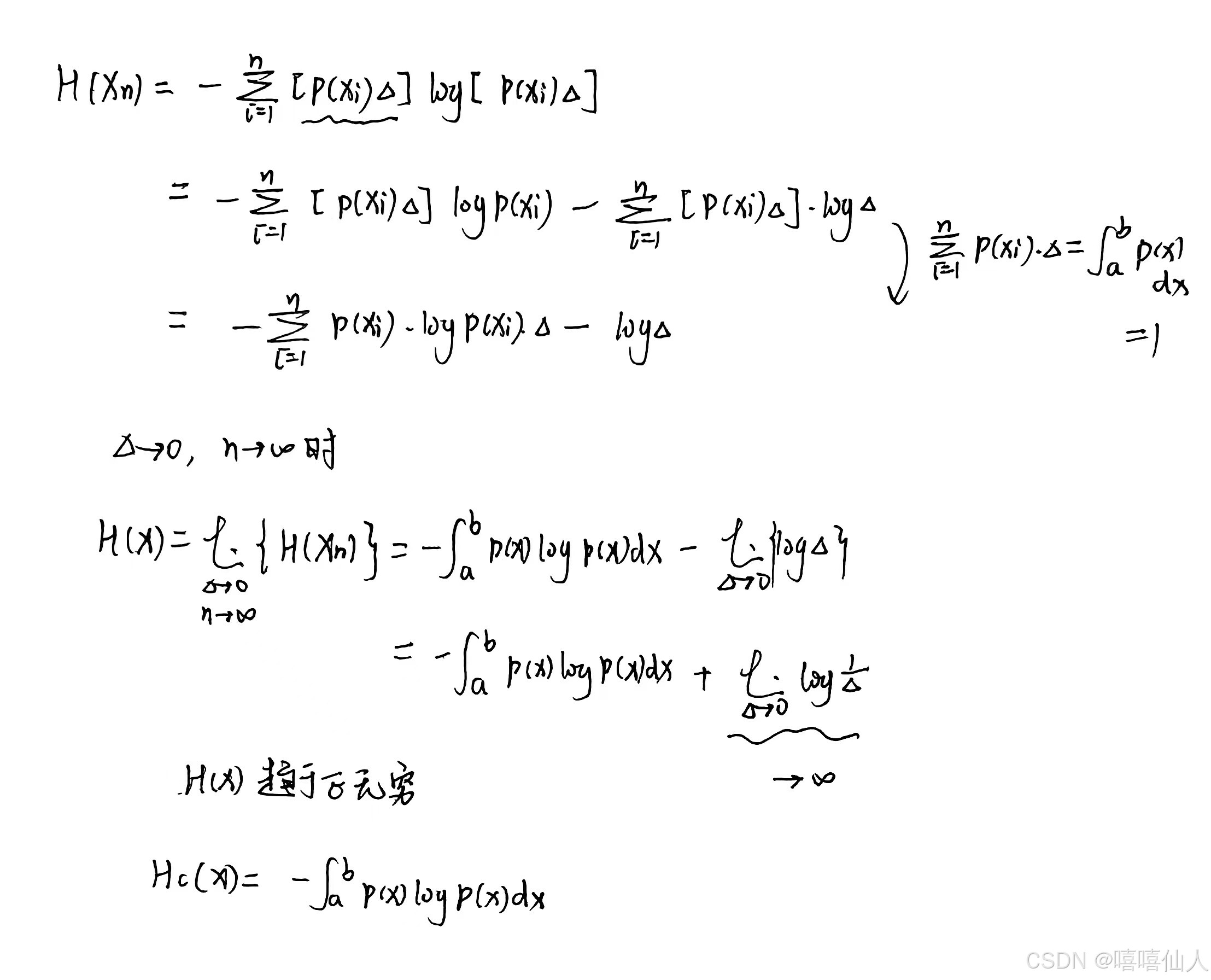 我们知道衡量离散信源的信息测度的模型是熵,而对于连续信源而言利用上述的微元法我们将其等效为离散信源,我们对于等效后的离散序列xi求离散信源的熵: